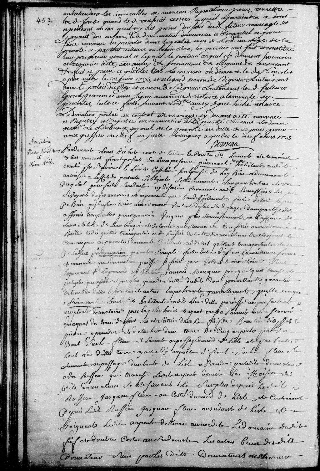Donation par Pierre Noël, habitant au comté de Saint-Laurent, paroisse Saint-Pierre, et Louise Gosselin, sa femme; à Pierre Noël, leur fils, habitant audits lieu et paroisse; à savoir une terre sise et située dans le fief de Beaulieu dit paroisse Saint-Pierre; la présente donation est passée pardevant Louis Pichet, notaire royal en l'île et comté de Saint-Laurent (île d'Orléans)