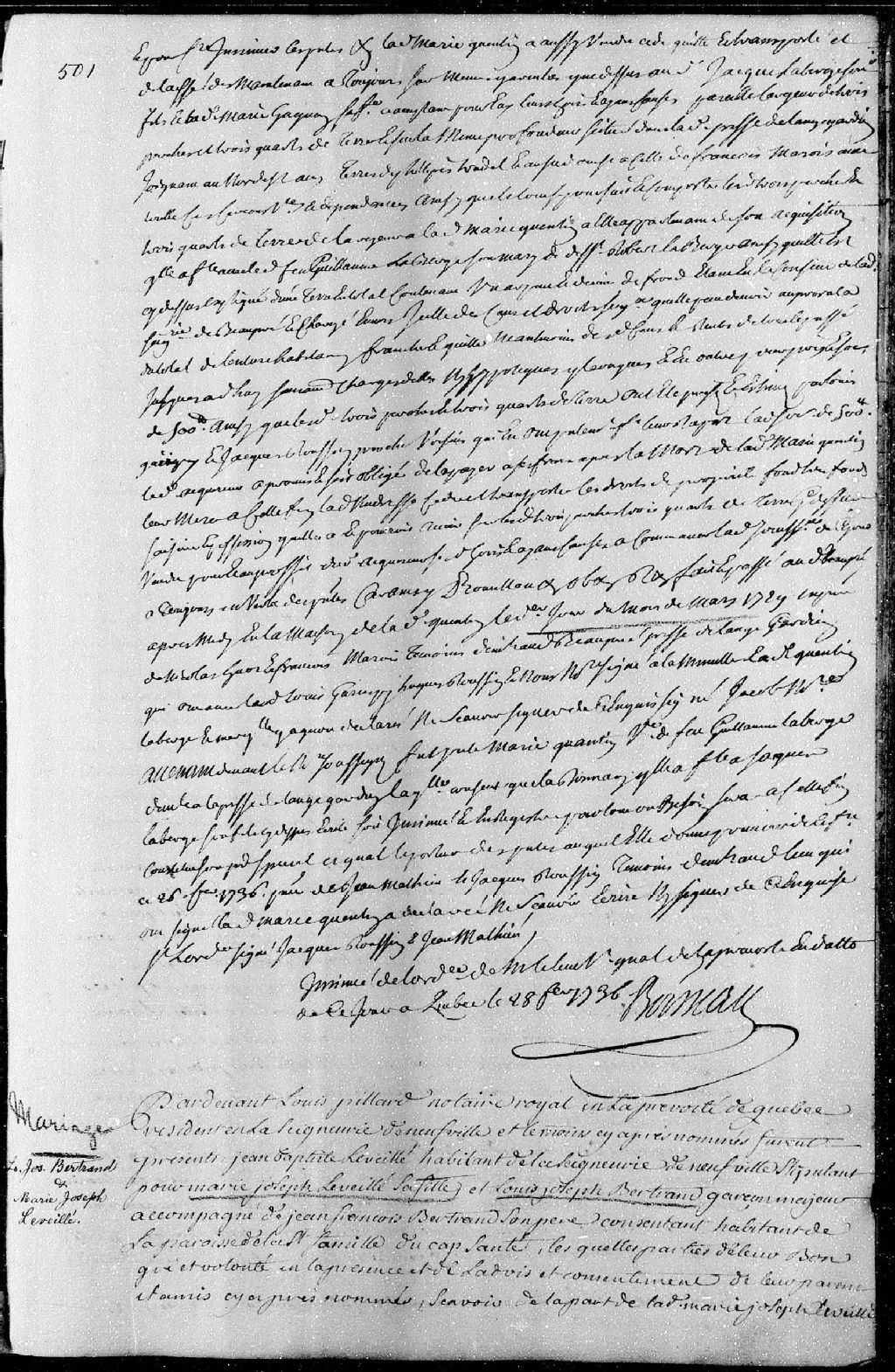 Contrat de mariage passé pardevant Louis Pillard, notaire royal en la Prévôté de Québec, entre Louis-Joseph Bertrand, garçon majeur, accompagné de Jean-François Bertrand, habitant de la paroisse Sainte-Famille-du-Cap-Santé, son père; et Marie-Josèphe Léveillé, fille de Jean-Baptiste Léveillé, habitant de la seigneurie de Neuville, son père, 31 janvier 1736 [Document insinué le 2 mars 1736], Archives nationales à Québec, Fonds Cour supérieure. District judiciaire de Québec. Insinuations, (03Q,CR301,P1770).