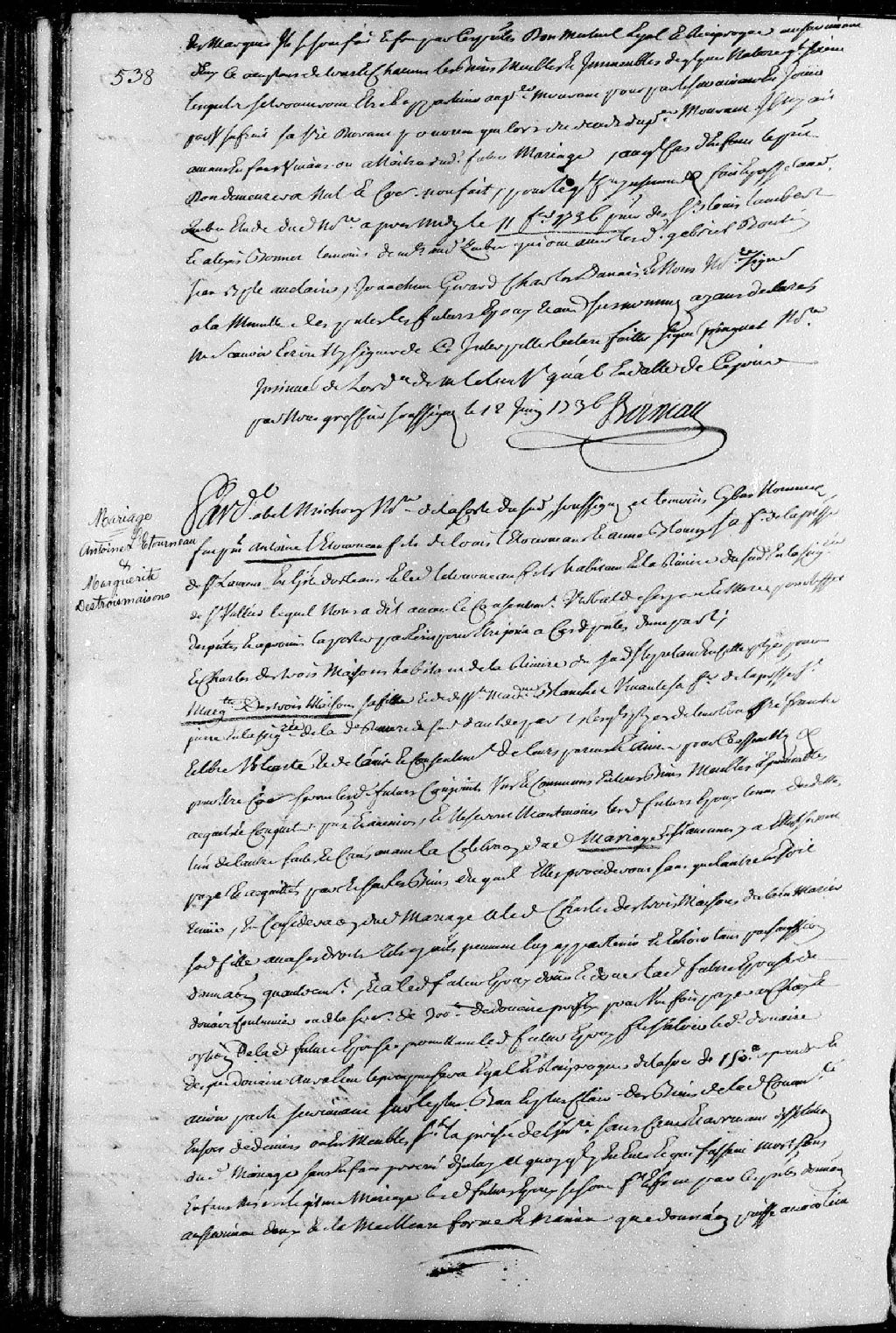 - Contrat de mariage entre Antoine Létourneau et Marguerite Destroismaisons; suivi du procès-verbal de la comparution d'Antoine Létourneau, en date du 10 avril 1736, pour représenter le consentement écrit de Louis Létourneau, son père, à son union avec Marguerite Destroismaisons.