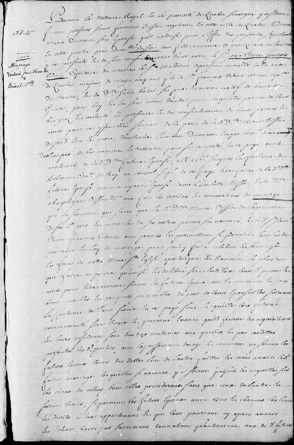 Contrat de mariage passé pardevant maître Boisseau, notaire royal en la Prévôté de Québec, entre Jean-Pierre-François Vederic, capitaine du navire «Le Saint-Mathieu», présentement mouillé en rade de Québec, majeur de 25 ans, fils de François Vederic, vivant capitaine de navire et de Julie Houel, ses père et mère, natif du Havre de Grâce; et Marie-Angélique Bissot, âgée de 15 ans, fille mineure de François Bissot, négociant de la ville de Québec, et de Marie Dumont (Lambert dit Dumont)