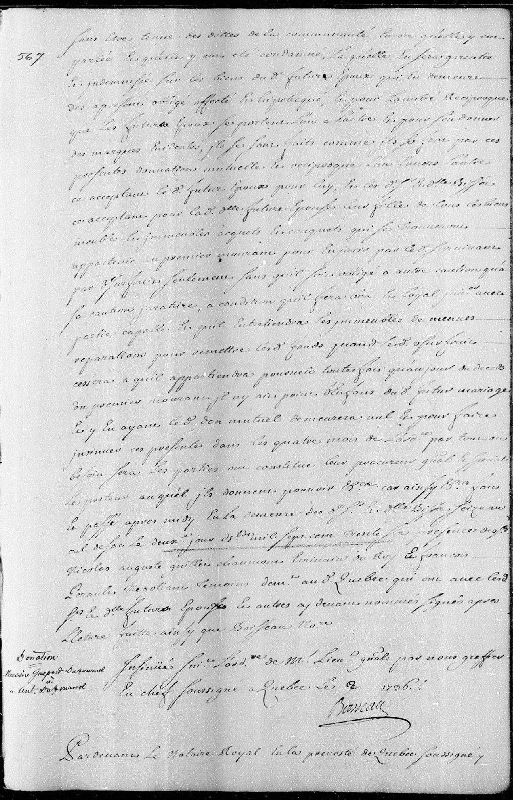 - Donation par Louis-Gaspard Dufournel, prêtre curé de la paroisse de L'Ange-Gardien; à Antoine Dufournel, son frère, prêtre chanoine de l'Église Collégiale, baron de Saint-Jean de Lyon, acceptant par Gabriel Greysac, négociant demeurant en la ville de Québec, son procureur; à savoir tous et chacun des droits légitimes que le donateur peut exiger et prétendre dans les successions des défunts Guillaume Dufournel et Madeleine Dufournel, leurs père et mère.