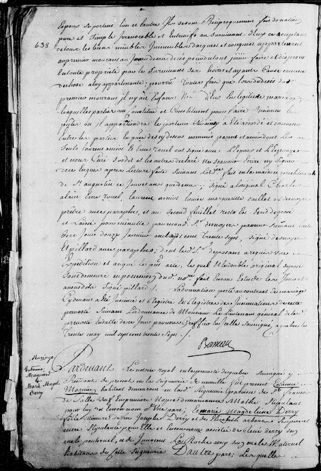 Contrat de mariage passé pardevant maître Barolet, notaire royal en la Prévôté de Québec, entre Étienne Magnien (Magnan), habitant demeurant en la seigneurie de Neuville, paroisse Saint-François-de-Sales, veuf en premières noces de défunte Marie-Anne Mathe (Matte); et Marie-Madeleine Derry (Déry), fille mineure de feu Joseph Derry et de Marie-Élisabeth Arbour (Harbour), ses père et mère, assistée de René Derry et Innocent Laroche, ses oncles