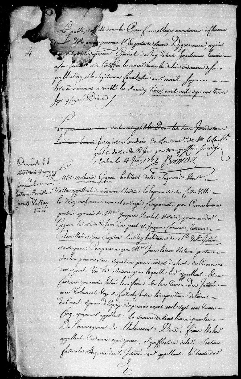 Le titre complet de la pièce se lit comme suit : Appel mis à néant de la sentence rendue en la Prévôté de Québec, le 29 mars 1737, dans l'affaire entre Mathurin Gagnon, habitant de la seigneurie de Saint-Vallier, contre Jacques Corriveau, Étienne Rémillard et Jean-Baptiste LeRoy, aussi habitants de Saint-Vallier, condamnant ledit Gagnon à payer la somme de 100 livres pour avoir enlevé les foins sur les terres des intimés avec violence et voies de fait; le Conseil met l'appellation au néant et condamne l'appellant à 3 livres d'amende pour son « fol appel » et aux dépens de la cause d'appel; il est également fait défense à Latour et à tous autres praticiens de se servir à l'avenir d'aucuns termes injurieux sous les peines de droit