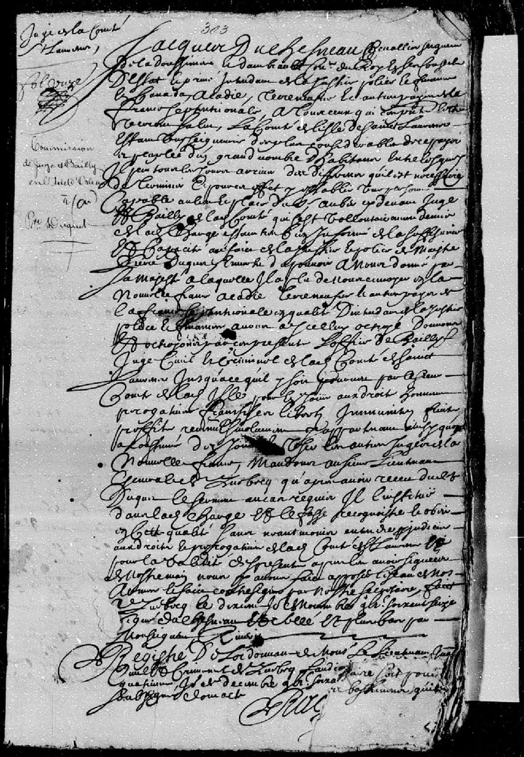 Commission de baillis, juge civil et criminel de la côte et de l'île Saint-Laurent, à maître Pierre Duquet, en lieu et place du sieur Aubin, juge baillis de la côte et île Saint-Laurent, qui s'est volontairement démis de ladite charge, 10 novembre 1676 [Document insinué le 4 décembre 1676], Archives nationales à Québec, Fonds Cour supérieure. District judiciaire de Québec. Insinuations, (03Q,CR301,P187).
