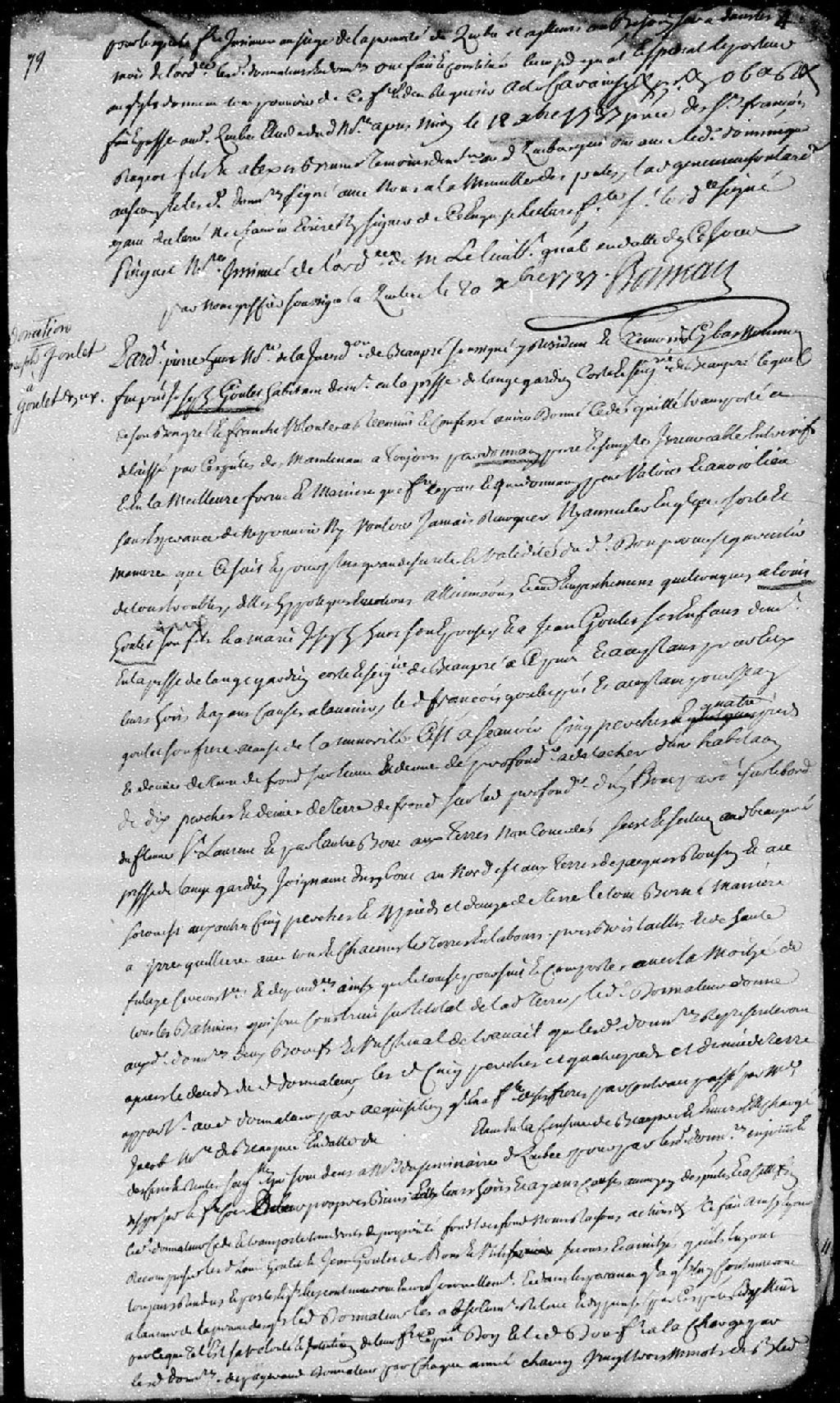 Donation par Joseph Goulet à Jean Goulet, Louis Goulet, et Marie-Josèphe Huot, femme de Louis Goulet; à savoir une terre faisant la moitié d'une habitation sise et située en la paroisse de L'Ange-Gardien, avec la moitié des bâtiments construits sur le total de l'habitation, deux boeufs et un cheval., 25 février 1737 [Document insinué le 20 décembre 1737], Archives nationales à Québec, Fonds Cour supérieure. District judiciaire de Québec. Insinuations, (03Q,CR301,P1898).
