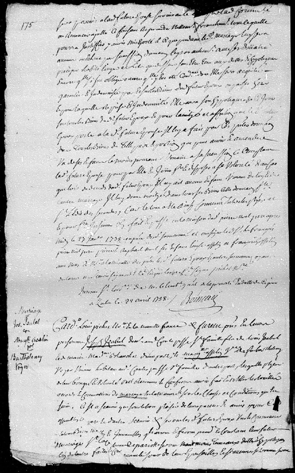 Contrat de mariage passé pardevant Louis Pichet, notaire royal en la Nouvelle-France, entre Joseph Isabel (Isabelle), demeurant au comté Saint-Laurent, paroisse Saint-Famille, fils de Louis Isabel et de Marie-Madeleine Blanchet, ses père et mère; et Marguerite Asselin, veuve de défunt Barthélemi Voyer, vivant habitant audit comté, paroisse Sainte-Famille
