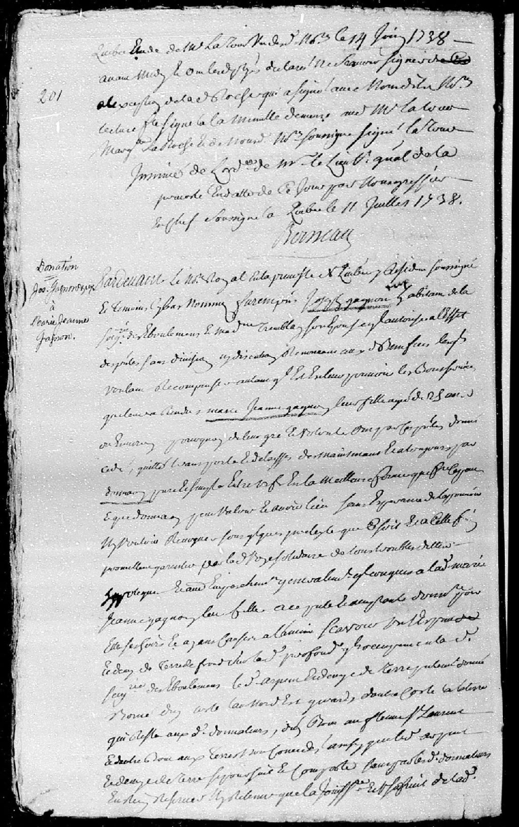 Donation par Joseph Gagnon, habitant de la seigneurie des Éboulements, et Marie-Madeleine Tremblay, son épouse; à Marie-Jeanne Gagnon, leur fille âgée de 25 ans; à savoir un arpent et demi de terre de front situé dans la seigneurie des Éboulements; la donation est passée pardevant maître Pinguet, notaire royal en la Prévôté de Québec, et ratifiée le 12 juillet 1738