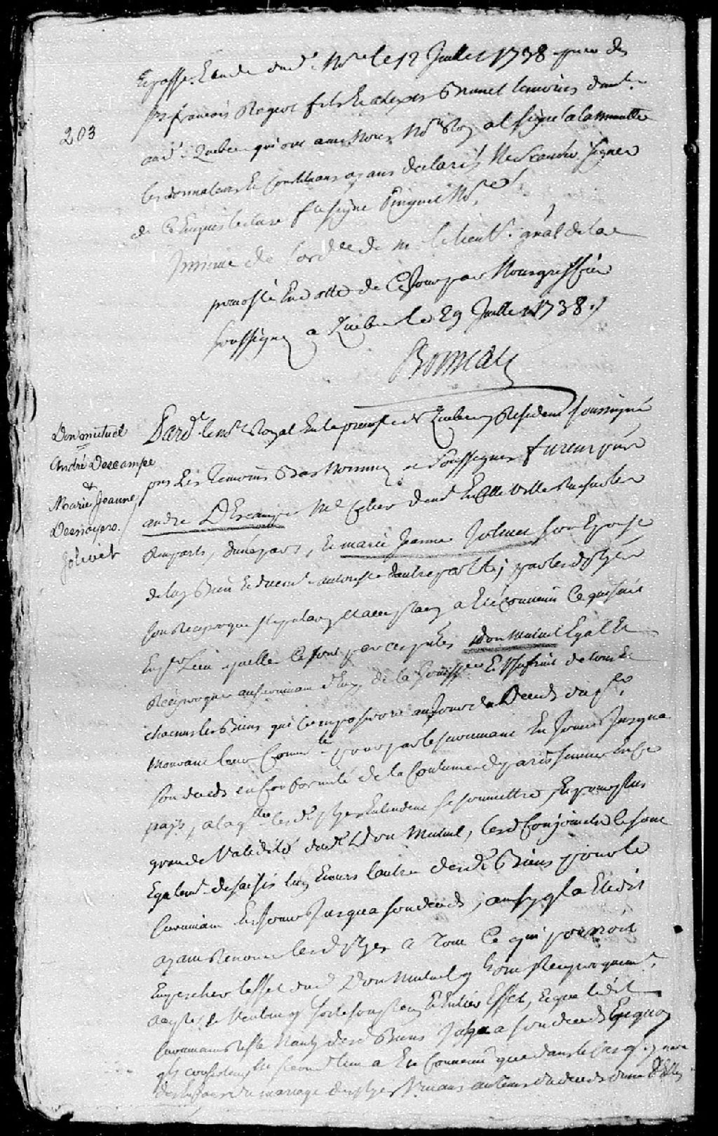 Donation mutuelle entre André Descampes (desnoyers dit Descampes), maître sellier demeurant en la ville de Québec, rue des Remparts, et Marie-Jeanne Jolivet, son épouse, de tous leurs biens meubles et immeubles; la donation est passée pardevant maître Latour, notaire royal en la Prévôté de Québec, 9 juin 1738 [Document insinué le 5 août 1738], Archives nationales à Québec, Fonds Cour supérieure. District judiciaire de Québec. Insinuations, (03Q,CR301,P1948).