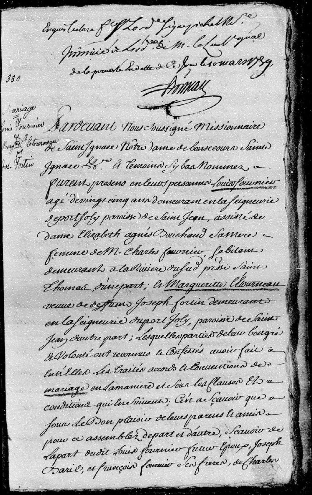 Contrat de mariage entre Louis Fournier, demeurant en la seigneurie de Port-Joly, paroisse Saint-Jean, et Marguerite Létourneau, veuve de feu Joseph Fortin, demeurant en la seigneurie de Port-Joly, paroisse Saint-Jean., 11 janvier 1739, 10 mars 1739 [Document insinué le 10 mars 1739], Archives nationales à Québec, Fonds Cour supérieure. District judiciaire de Québec. Insinuations, (03Q,CR301,P1993).