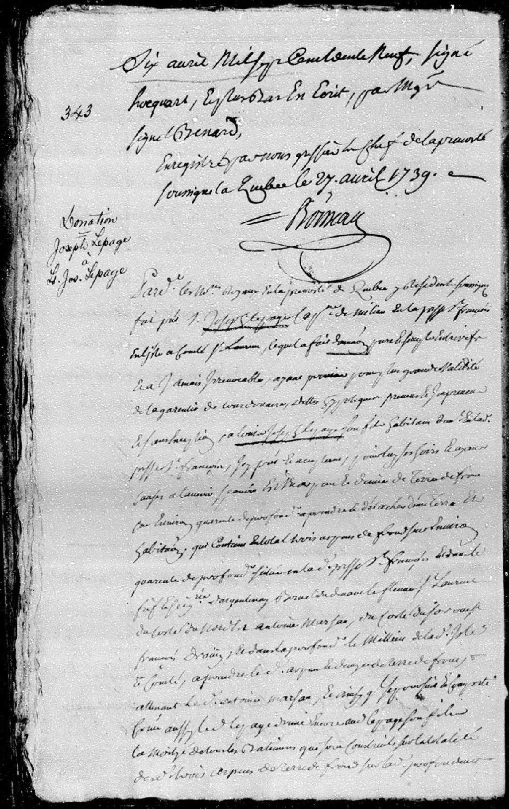 - La pièce se compose de la donation par Joseph Lepage, capitaine de milice en la paroisse Saint-François, en l'île et comté Saint-Laurent (île d'Orléans); à Louis-Joseph Lepage, son fils, habitant du même lieu; à savoir un arpents et demi de terre de front sur environ quarante de profondeur, à prendre et détacher d'une terre et habitation de trois arpents sise et située en ladite paroisse Saint-François et dans le fief et seigneurie d'Argentenay, avec la moitié des bâtiments construits sur l'ensemble de l'habitation; ladite donation est passée pardevant Boucault et Latour, notaires royaux en la Prévôté de Québec.