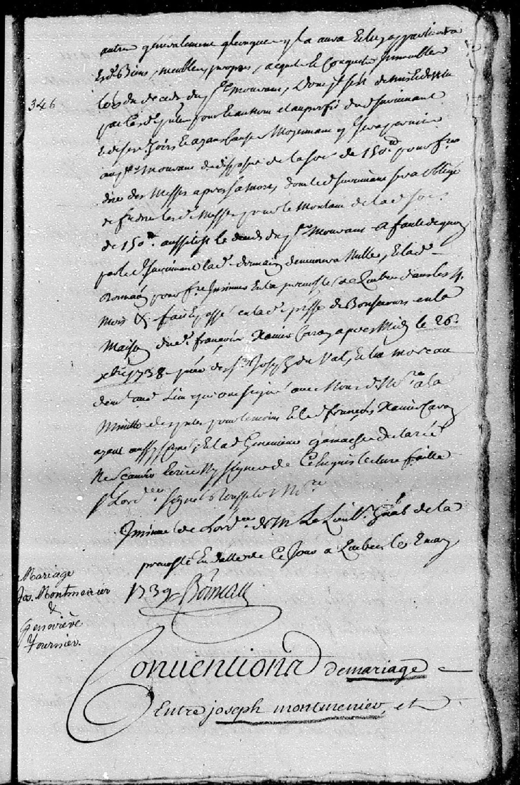 Contrat de mariage passé pardevant le prêtre Mercier, faisant les fonctions curiales en la paroisse Saint-Michel, à défaut de notaire audit lieu, entre Joseph Montmenier (Montminy - Montmainier), fils de Joseph Montmenier et de Marie-Angélique Forgues, ses père et mère; et Geneviève Fournier, assistée de Jean Fradet, son grand-père, et de Jacques Fournier, son oncle et tuteur; ledit contrat est collationné à sa minute et déposé en l'étude de maître Boisseau, notaire, le 2 mai 1739
