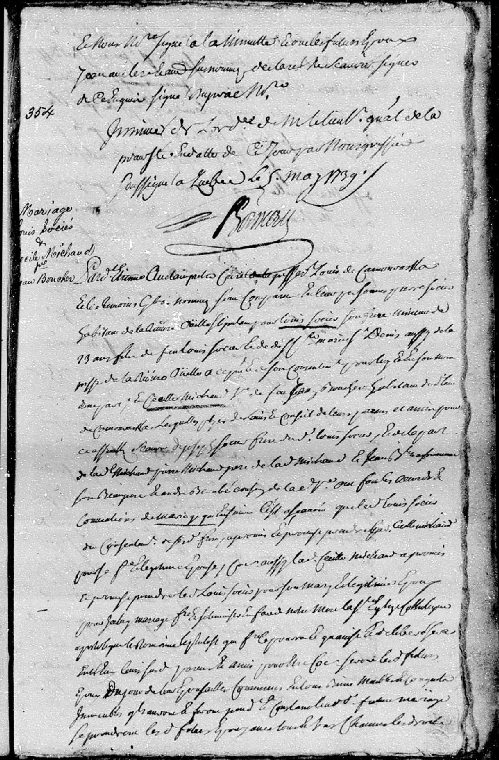- La pièce se compose du contrat de mariage passé pardevant Étienne Auclair, prêtre, curé de la paroisse Saint-Louis-de-Kamouraska, entre Louis Socier (Saucier - Saussier), mineur de 23 ans, fils des défunts Louis [Charles] Socier (Saucier - Saussier) et Marie Saint-Denis, ses père et mère, vivants habitants de la paroisse de la Rivière-Ouelle, stipulant par Pierre Socier (Saucier - Saussier), son frère, habitant du même lieu; et Cécile Michaud, veuve de feu Jean Boucher, habitant dudit lieu de Kamouraska, fille de Pierre Michaud.