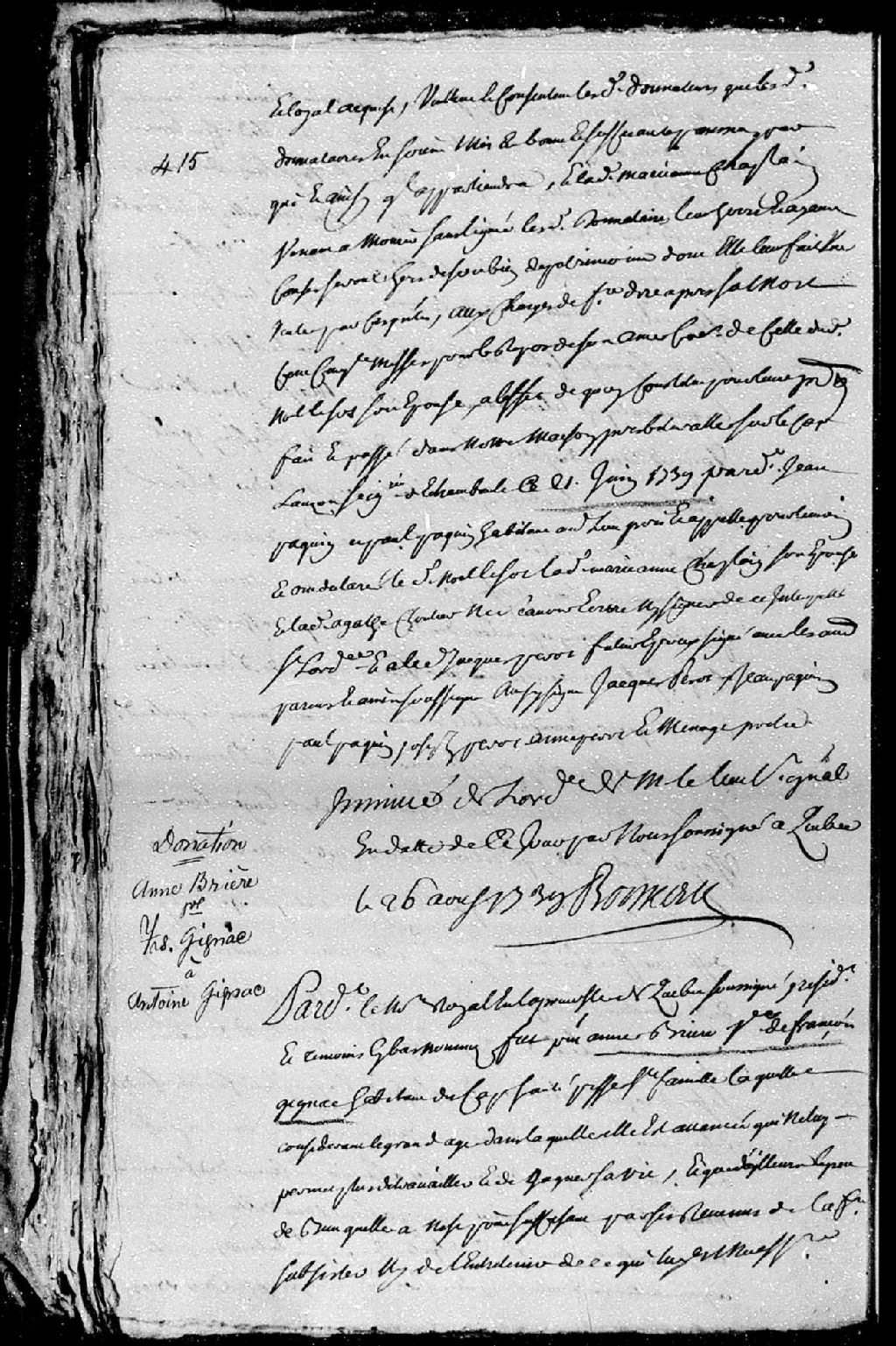 Donation par Anne Brière, veuve de feu François Gignac, habitant du Cap-Santé, paroisse Sainte-Famille; à Antoine Gignac, son fils; à savoir un arpent de terre de front sur toute la profondeur, sis audit lieu du Cap-Santé; ladite donation est passée pardevant maître Rageot, notaire royal en la Prévôté de Québec, 13 juin 1739 (Document insinué le 1er septembre 1739), Archives nationales à Québec, Fonds Cour supérieure. District judiciaire de Québec. Insinuations, (03Q,CR301,P2024).