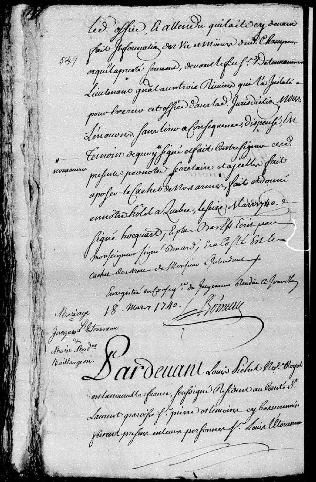 Contrat de mariage passé pardevant Louis Pichet, notaire royal en la Nouvelle-France, entre Jacques Létourneau, fils de Louis Létourneau, habitant au comté et paroisse Saint-Laurent (île d'Orléans); et Marie-Madeleine Baillargeon, fille de Nicolas Baillargeon, habitant audit comté, paroisse Saint-Laurent, et de Marguerite Leclerc, ses père et mère, 28 octobre 1739 (Document insinué le 18 mars 1740), Archives nationales à Québec, Fonds Cour supérieure. District judiciaire de Québec. Insinuations, (03Q,CR301,P2060).