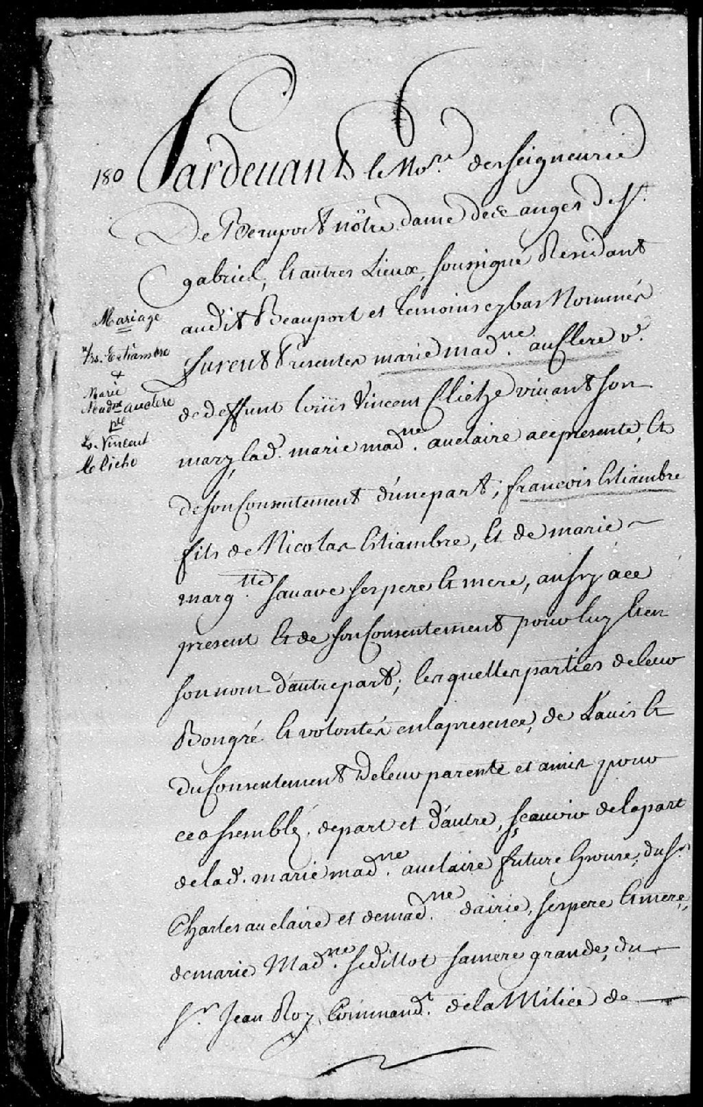 Contrat de mariage passé pardevant maître Duprac (Dupras - Duprat), notaire des seigneuries de Beauport, Saint-Gabriel et Notre-Dame-des-Anges, entre François Estiambre, fils de Nicolas Estiambre et de Marie-Marguerite [Marie-Madeleine] Savard, ses père et mère; et Marie-Madeleine Auclerc (Auclair), veuve de défunt Louis-Vincent Cliche, fille de Charles Auclair et de Madeleine Dairie (Déry)