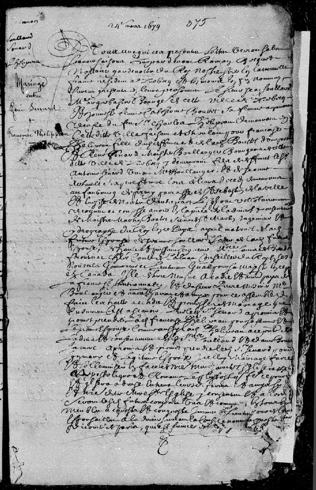 La pièce se compose du mariage entre René Senard, maître boulanger et bourgeois de Québec, fils du feu sieur Antoine Senard, de son vivant maître boulanger, et de Jeanne Artault, ses père et mère du faubourg Saint-Pierre en la paroisse de Saint-Sébastien en la ville et évêché de Nantes, et Françoise Philippeau, fille du feu sieur Charles Philippeau et de Catherine Bouttet (Boutet), le sieur Jean Soullard (Soulard), maître arquebusier et bourgeois de Québec, et Catherine Bouttet (Boutet), sa femme auparavant veuve dudit feu Philippeau, stipulant pour ladite Françoise, absente, sont présent maître Martin Boutet, sieur de Saint-Martin, ingénieur et hydrographe du Roi en Nouvelle-France, aïeul maternelle de ladite future épouse, Jeanne Soullard (Soulard), messire Louis de Buade Frontenac, chevalier, comte de Palluau, conseiller du Roi en ses Conseils, gouverneur et lieutenant général pour le Roi en Nouvelle-France, et le sieur Pierre Mosnier, maître boulanger, tous parents et amis des futurs époux, Guillaume Roger, huissier au Conseil souverain, et Étienne Marandeau, demeurant à Québec, sont témoins.