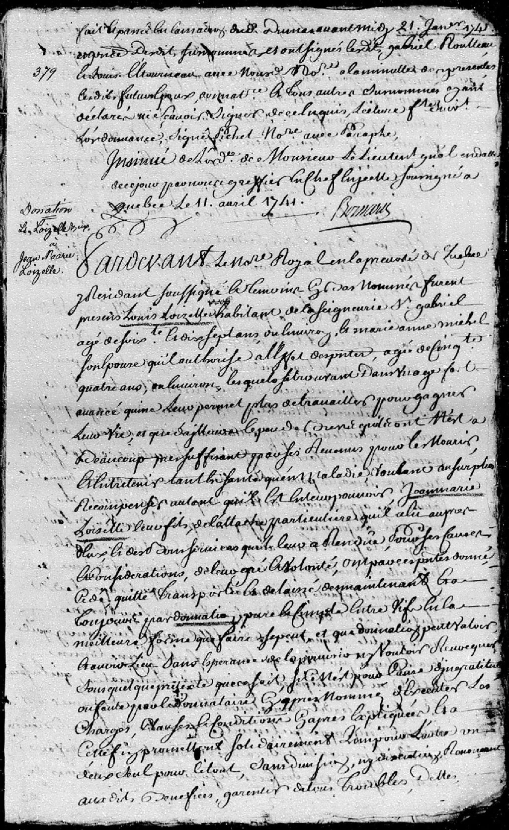 - La pièce se compose de la donation par Louis Loiselle (Loisel), habitant de la seigneurie Saint-Gabriel, âgé d'environ 77 ans, et Marie-Anne Michel, son épouse, âgée de 54 ans; à Jean-Marie Loiselle, leur fils; à savoir un arpent et demi de terre de front, sis en la seigneurie Saint-Gabriel, avec le vieux bâtiment qui s'y trouve construit et la moitié de tous les autres bâtiments, meubles et ustensiles de ménage qui se trouvent actuellement appartenir aux donateurs; l'acte de donation est passé pardevant maître Pinguet, notaire royal en la Prévôté de Québec.