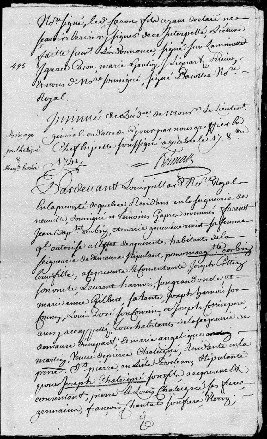 Contrat de mariage passé pardevant Louis Pillard, notaire royal en la Prévôté de Québec, entre Joseph Châteigné (Châtigny), fils de défunt Pierre Châteigné et Marie-Angélique Martin, demeurant en la paroisse Saint-Pierre, en l'île d'Orléans, ses père et mère; et Marguerite Corbin, fille de Jean-Baptiste Corbin et de Marie-Geneviève Amiot, habitants de la seigneurie de Maur