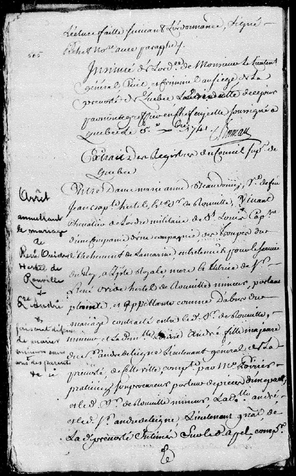 - Le titre complet de la pièce se lit comme suit : Arrêt dans la cause entre Marie-Anne Baudoin, veuve de Jean-Baptiste Hertel de Rouville, chevalier de Saint-Louis et capitaine dans les troupes de la Marine à l'île Royale, mère et tutrice de René-Ovide Hertel de Rouville, mineur, portant plainte et appelante comme d'abus du mariage contracté entre le dit René-Ovide Hertel de Rouville, son fils, et Louise André, fille majeure de Pierre André de Leigne, conseiller du roi et son lieutenant général civil et criminel au siège de la Prévôté de Québec, comparante par le sieur Poirier, praticien, son procureur; contre le sieur de Rouville, mineur, la demoiselle André et le sieur Pierre André de Leigne, intimés, comparants par le sieur Nouette, leur procureur. Le Conseil reçoit le Procureur général du Roi appelant comme d'abus de la dispense des trois bancs accordés par le vicaire général du diocèse de Québec au dit sieur de Rouville, mineur, pour épouser la dite demoiselle André, fille majeure.Le Conseil tient ledit appel pour bien relevé et faisant droit, tant sur celui-ci que celui de la veuve de Rouville, mère et tutrice dudit de Rouville, mineur, de la célébration du mariage, dit qu'il a été nul, nullement et abusivement procédé et célébré et, en conséquence, déclare le mariage non valablement contracté. Fait défense audit de Rouville et à ladite demoiselle André de prendre la qualité de mari et de femme et de se hanter et fréquenter sous les peines de droit. Enjoint pareillement à tous les notaires de passer des contrats de mariage de mineurs sans qu¿ils soient dûment accompagnés de leurs père, mère, tuteur ou curateur qui signeront audit contrat. Enjoint à tous les curés et prêtres de marquer dans les actes de célébration de mariage si les contractants sont enfants de famille, en tutelle ou curatelle ou en la puissance d'autrui, d'y énoncer les consentements de leurs pères, mères, tuteurs, curateurs, etc.; d'y faire appeler et assister non pas seulement deux témoins mais quatre suivant les ordonnances; les actes de mariage seront inscrits dans les registres de l'église paroissiale du lieu où le mariage sera célébré
