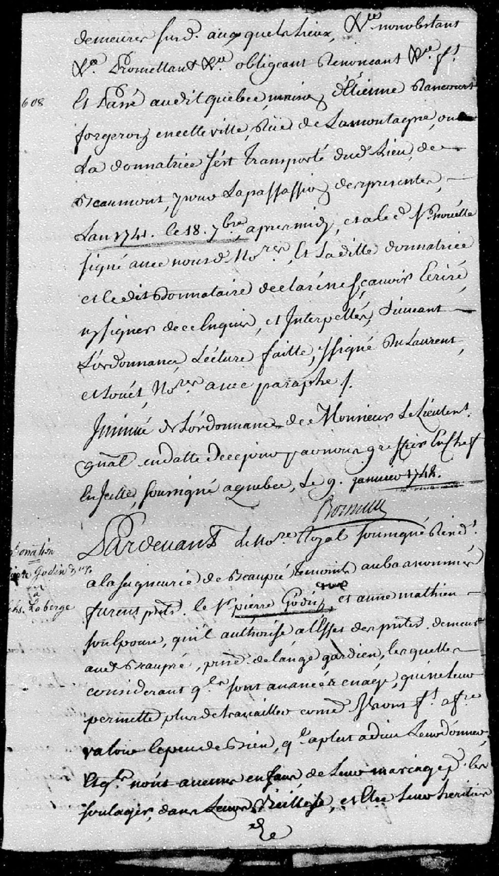 - La pièce se compose de la donation par Pierre Godin et Anne Mathieu, mari et femme, demeurant en la seigneurie de Beaupré, paroisse de L'Ange-Gardien; à Charles Laberge, leur neveu, considérant que les donateurs n'ont aucun enfant; à savoir une terre sise et située audit lieu de Beaupré, paroisse de L'Ange-Gardien, sur le bord du fleuve Saint-Laurent, avec les bâtiments qui y sont construits ainsi que les meubles et ustensiles de ménage appartenant aux donateurs; la donation est passée pardevant Jacob, notaire royal en la seigneurie de Beaupré.