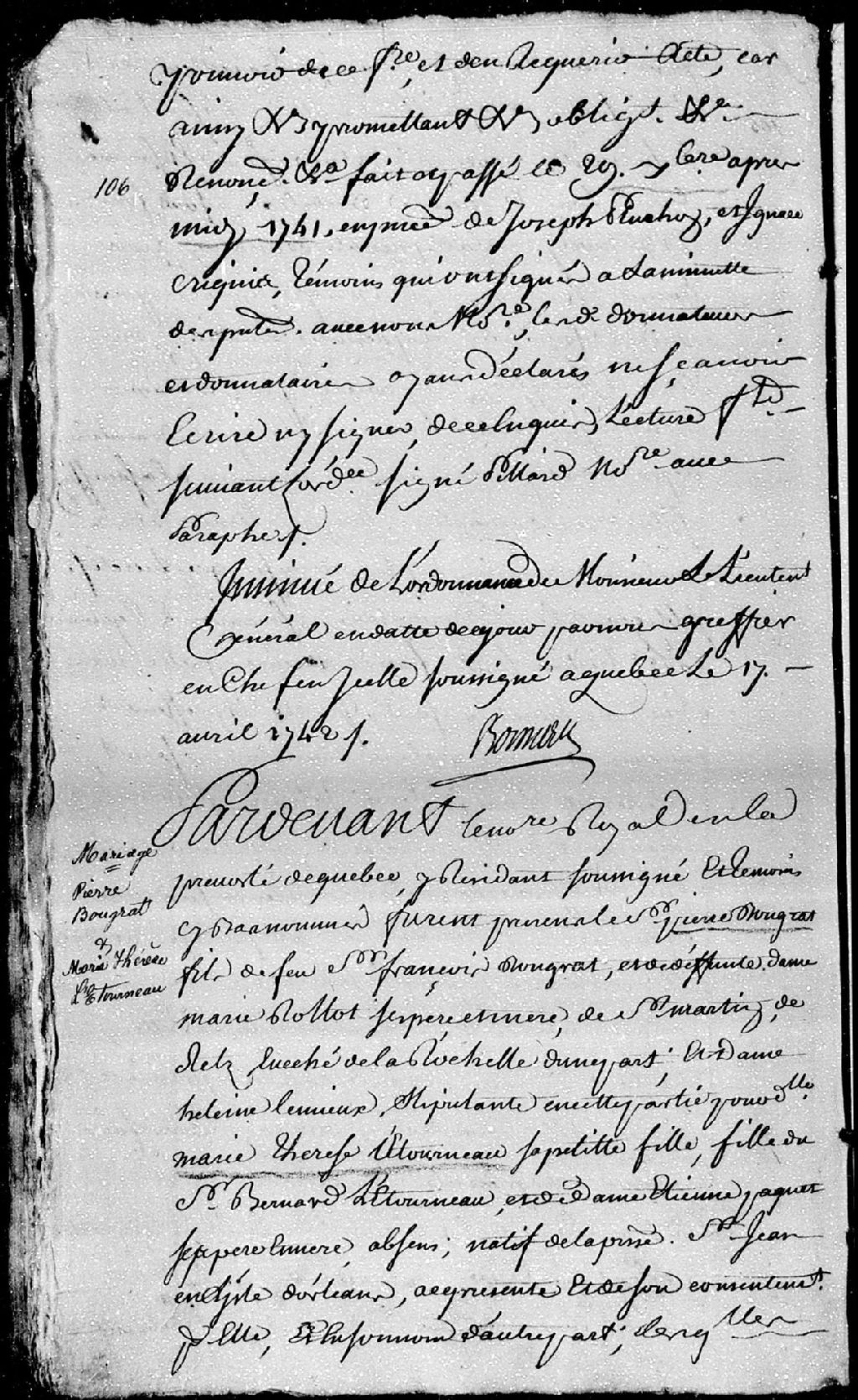 Contrat de mariage passé pardevant maître Pinguet, notaire royal en la Prévôté de Québec, entre Pierre Bougrat, fils de feu François Bougrat et de défunte Marie Rottot, ses père et mère, de Saint-Martin-de-Retz, évêché de La Rochelle; et Marie-Thérèse Létourneau, fille de Bernard Létourneau et d'Hélène Paquet, ses père et mère, absents, natifs de la paroisse Saint-Jean, en l'île d'Orléans, stipulant par Hélène Lemieux, sa grand-mère