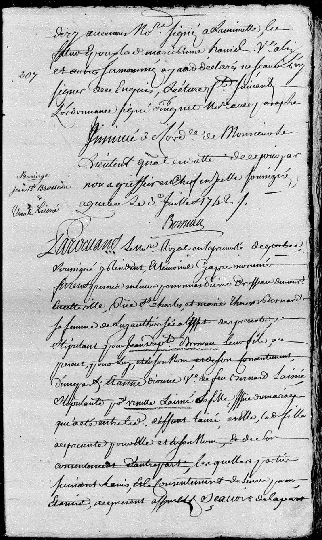 Contrat de mariage passé pardevant maître Dubreuil, notaire royal en la Prévôté de Québec, entre Jean-Baptiste Brosseau (Brouseau), fils de Pierre Brosseau, demeurant en la ville de Québec, rue du Saint-Charles, et Marie-Thérèse Bernard, ses père et mère; et Ursule Laisné (Laîné), fille de défunt Bernard Laisné et d'Anne Dionne