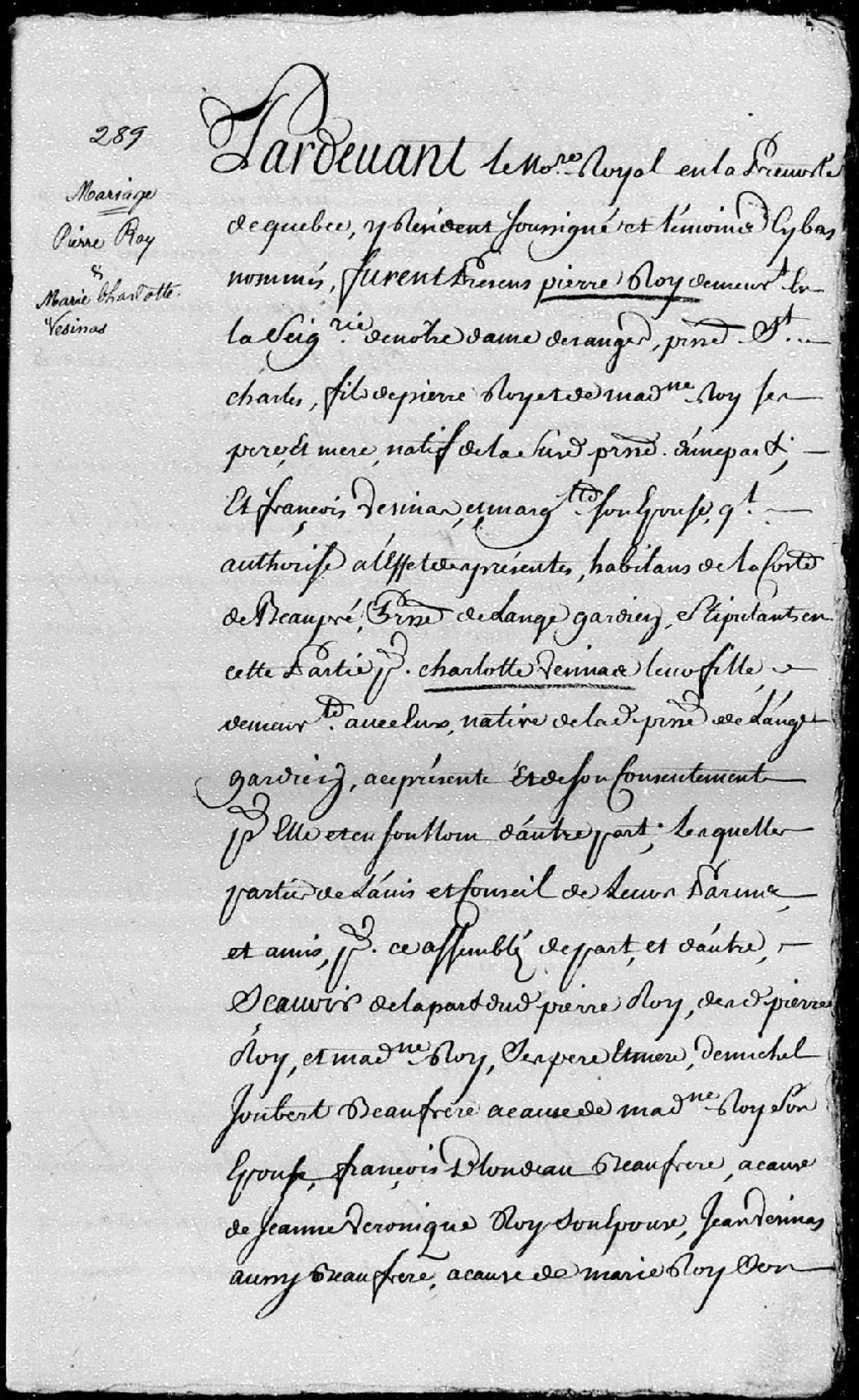 - Contrat de mariage passé pardevant Pinguet, notaire royal en la Prévôté de Québec, entre Pierre Roy, natif de la seigneurie de Notre-Dame-des-Anges, paroisse Saint-Charles, y demeurant, fils de Pierre Roy et de Marie-Madeleine Roy, ses père et mère; et Charlotte Vézina, native de la paroisse de L'Ange-Gardien, en la côte de Beaupré, fille de François Vézina et de Marguerite Mathieu, ses père et mère, habitants audit lieu de Beaupré, paroisse de L'Ange-Gardien
