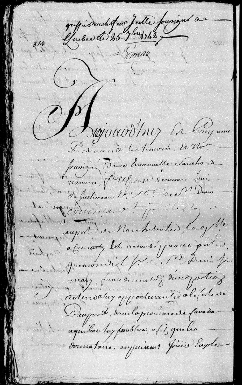 Donation par Louis Juchereau, écuyer, sieur de Saint-Denis, suivant le consentement d'Emanuela Ramón de Navarro, son épouse, à Marie-Anne-Josèphe et Thérèse-Madeleine de L'Estringant de Saint-Martin, ses nièces; à savoir la part et portion de terre pouvant appartenir audit Juchereau en la seigneurie ou fief situé à la Grande-Anse, côte de Beauport, à charge des donataires d'en payer toutes les charges et dettes.