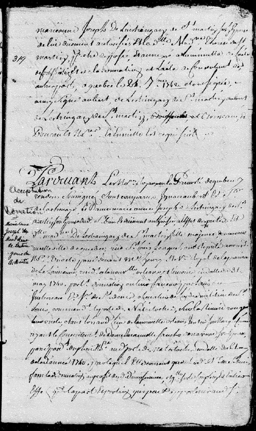 - Acceptation par Ignace Aubert, écuyer, sieur de LaChesnaye, au nom et comme ayant épousé Marie-Anne-Josèphe de L'Estringant de Saint-Martin, et Thérèse-Madeleine de L'Estringant de Saint-Martin, fille majeure, d'une donation à elles faite par leur oncle Louis Juchereau, écuyer, sieur de Saint-Denis, d'une part et portion de terre située à la Grande-Anse, dans le fief de Saint-Denis, en la côte de Beauport.
