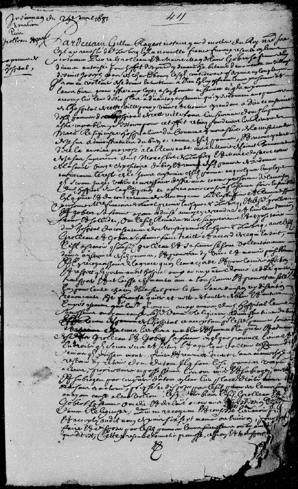 - Donation par Pierre Grolleau (Groleau) et Marie-Madeleine Gobert, sa femme, aux pauvres de l'hôpital de Québec, ladite donation concernant les services que lesdits Groleau et sa femme entendent rendre audits pauvres, tous leurs biens meubles et immeubles, lesdits donateurs ayant l'intention de vivre au couvent et monastère de la miséricorde de Jésus et d'y mourir, contre quoi lesdits donateurs seront logés, entretenus et vêtus.