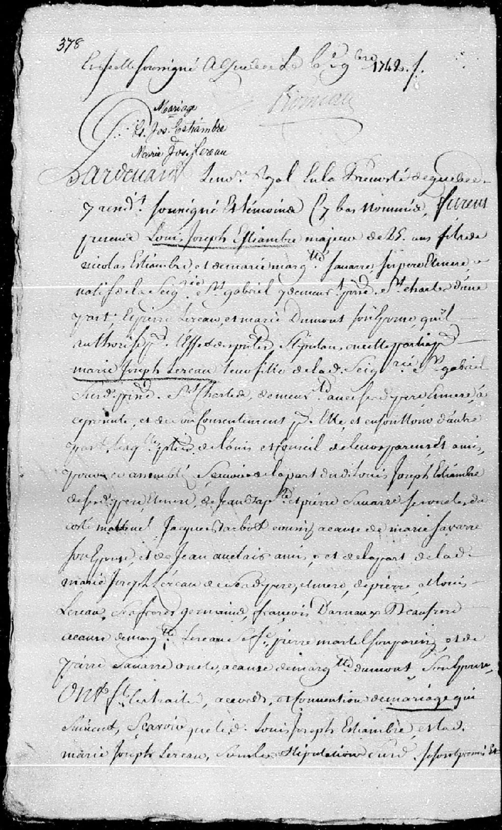 Contrat de mariage passé pardevant maître Pinguet, notaire royal en la Prévôté de Québec, entre Louis-Joseph Estiambre, majeur de vingt-cinq ans, fils de Nicolas Estiambre (dit Sansfaçon) et de Marie-Marguerite [Marie-Madeleine] Savarre (Savard), ses père et mère, natif de la seigneurie Saint-Gabriel, y demeurant, paroisse Saint-Charles; et Marie-Josèphe Lereau, fille de Pierre Lereau et de Marie Dumont, ses père et mère, demeurant audit lieu de Saint-Gabriel, paroisse Saint-Charles