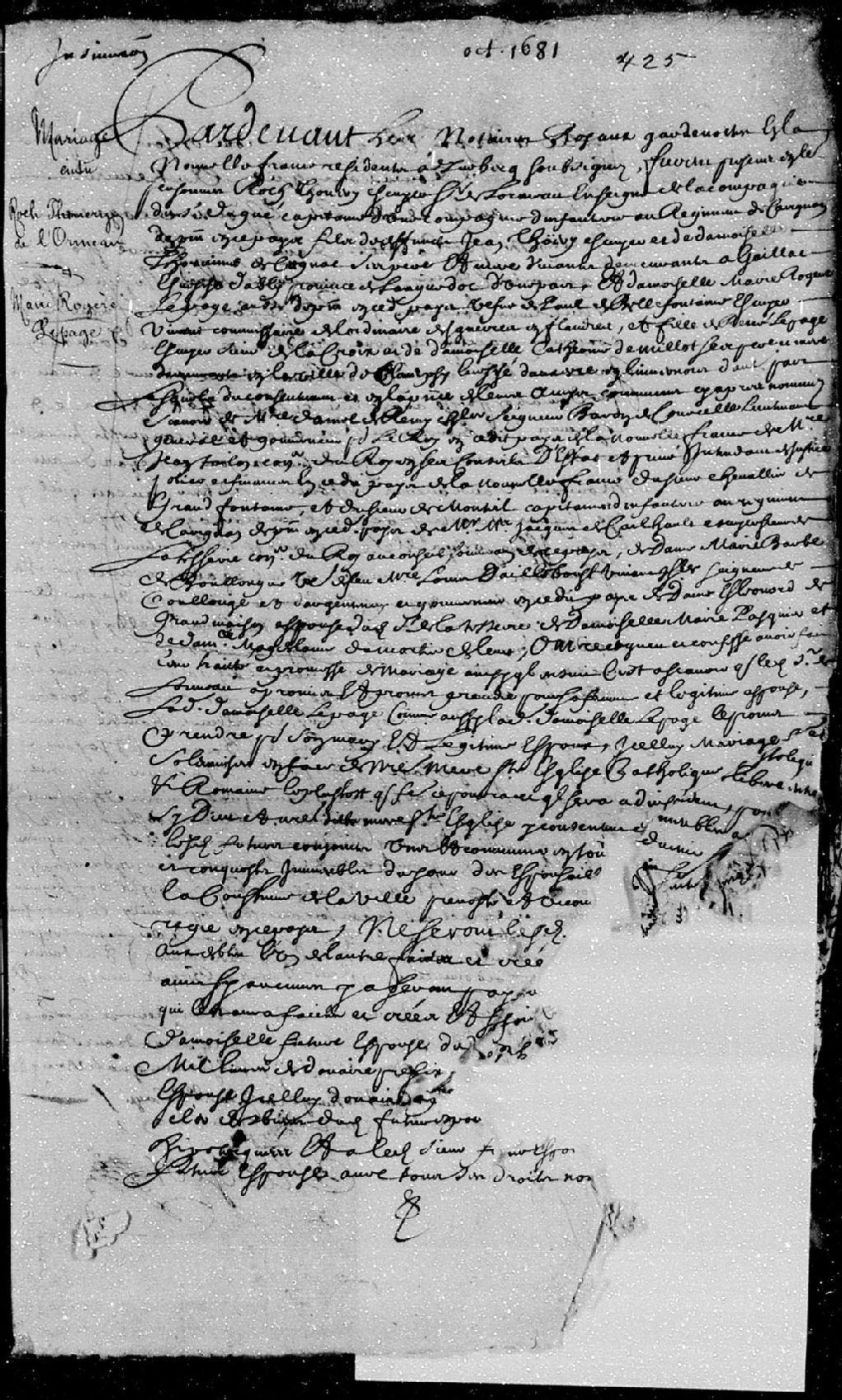 - La pièce se compose du mariage entre Roch Thouery (Thoery), écuyer, sieur de L'Ormeau, enseigne de la compagnie du sieur Dugué (Duguay), capitaine d'une compagnie d'infanterie au régiment de Carignan, fils du feu Jean Thouery (Thoery), de son vivant écuyer, et de demoiselle Thorainne (Thorenne) de Cugnac (Cuignac), ses père et mère de Gaillac en l'évêché d'Albi en la province du Languedoc, et Marie-Rogère Lepage, veuve du feu Paul de Bellefontaine, de son vivant écuyer, commissaire de l'ordinaire des guerres en Flandre, fille de René LePage, écuyer, sieur de la Croix (Lacroix), et de demoiselle Catherine de Millot, ses père et mère demeurant en la ville de Clamecy en l'évêché d'Autun en Livernois, sont présent messire Daniel de Rémy, chevalier, seigneur et baron de Courcelle, lieutenant général et gouverneur pour le Roi en Nouvelle-France, messire Jean Talon, conseiller du Roi en ses Conseils, intendant de justice, police et finance en Nouvelle-France, le sieur Chevalier de Grand Fontaine (Grandefontaine), le sieur de Monteuil (Montreuil), capitaine d'infanterie au régiment de Carignan, maître Jacques de Cailhaut, écuyer, sieur de la Tesserye (LaTesserie - Tesserie), conseiller du Roi au Conseil souverain, dame Marie-Barbe de Boulogne, veuve du feu maître Louis d'Ailleboust, de son vivant écuyer, seigneur de Coulonge et d'Argentenay, gouverneur en Nouvelle-France, dame Éléonore de Grandmaison, épouse dudit sieur de la Tesserye (LaTesserie - Tesserie), demoiselle Marie Pasquin (Paquin), et demoiselle Madeleine Dumortier (Dumontier), amis des futurs époux (manque le coin inférieur gauche de la page).