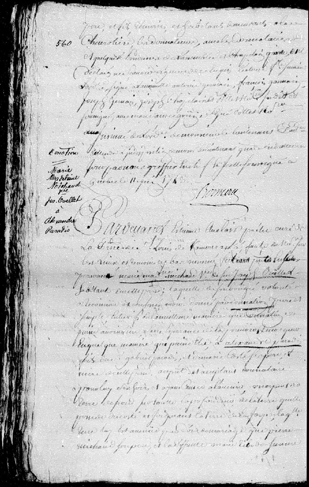 - Donation par Marie-Madeleine Michaud, veuve de défunt Joseph Ouellet, à Alexandre Paradis, fils de Gabriel Paradis et de Marie Côté; à savoir un arpent de terre de front sur toute la profondeur de la terre, laquelle terre a échu à la donatrice par donation de mariage que lui ont fait Pierre Michaud et défunte Marie Tibodo (Thibodeau), ses père et mère, avec en outre la jouissance d'un autre arpent de terre.
