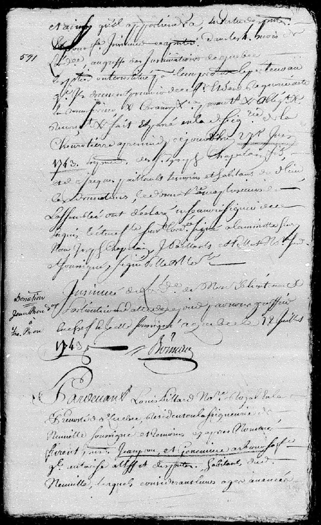 - Le titre complet de la pièce se lit comme suit : Donation par Jean-Baptiste Prou (Proulx) et Marie-Geneviève Arbour (Harbour), mari et femme, habitants de la seigneurie de Neuville; à François Prou, leur fils; à savoir tous et chacun des biens meubles et immeubles pouvant appartenir aux donateurs, consistant notamment en une terre et habitation de deux arpents de front sur quarante de profondeur, sise audit lieu de Neuville, sur le bord du fleuve Saint-Laurent, avec divers bestiaux, meubles et ustensiles d'agriculture; la donation est passée par-devant Louis Pillard, notaire royal en la Prévôté de Québec