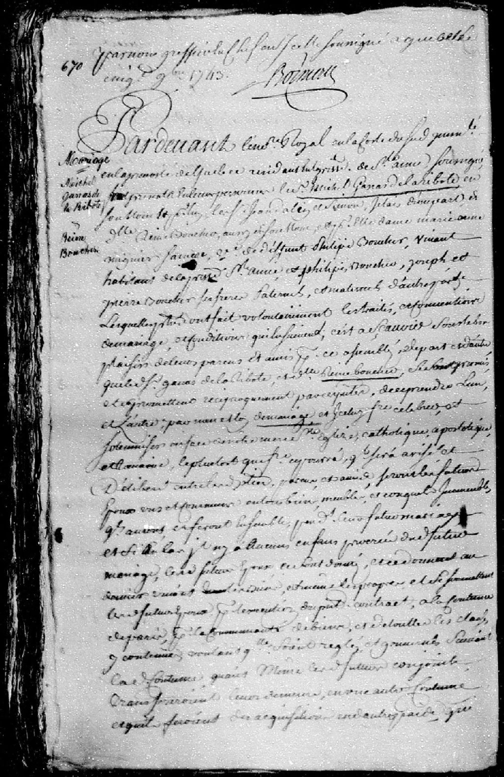 Contrat de mariage passé pardevant Joseph Dionne, notaire royal en la côte du Sud, entre Michel Ganas de la Ribote (Gannat dit Delaribot); et Reine Boucher, fille de Marie-Anne Mignier et de défunt Philippe Boucher, vivant habitant de la paroisse Sainte-Anne