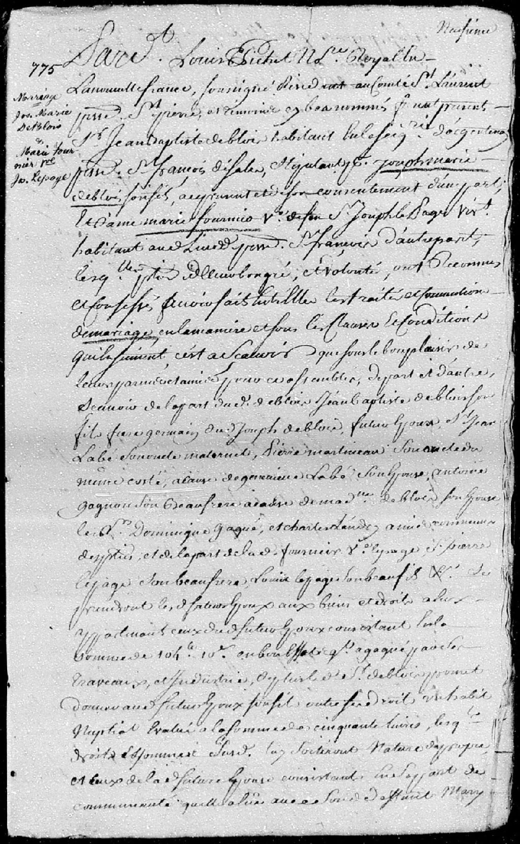 Contrat de mariage passé pardevant Louis Pichet, notaire royal en la Nouvelle-France, entre Joseph-Marie Deblois, fils de Jean-Baptiste Deblois, habitant de la seigneurie d'Argentenay, paroisse Saint-François-de-Sales; et Marie Fournier, veuve de défunt Joseph Lepage, vivant habitant audit lieu, paroisse Saint-François-de-Sales