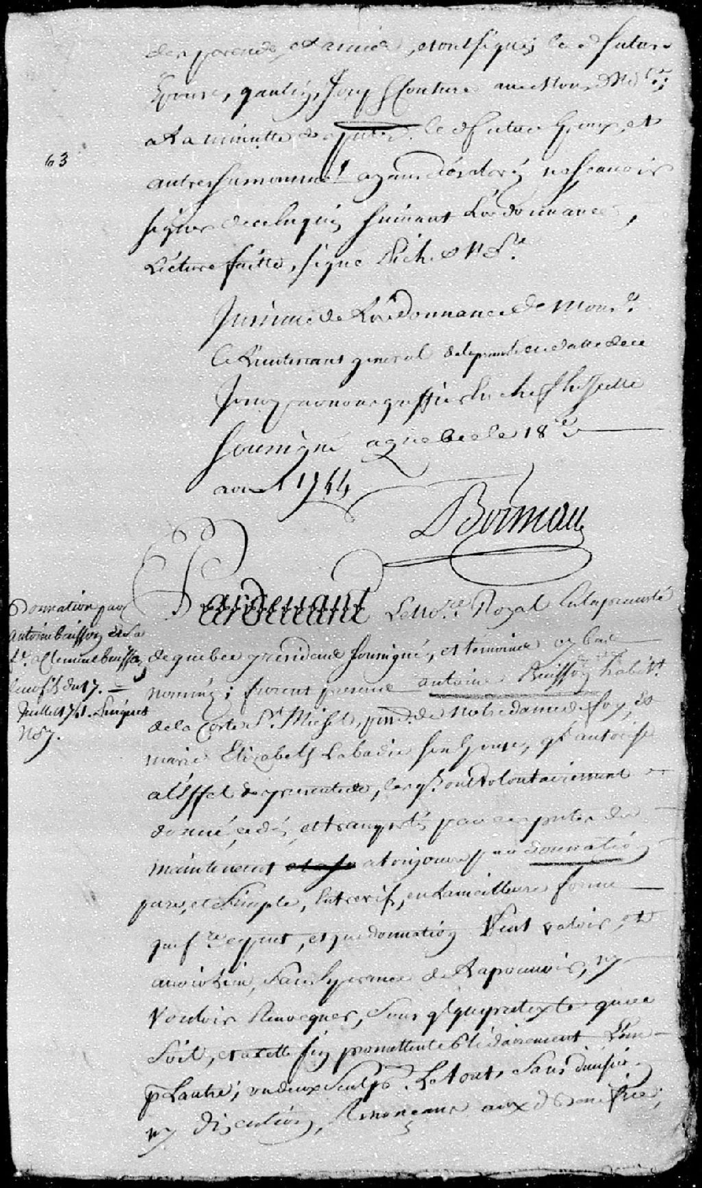 - Donation par Antoine Buisson (Bisson) et Marie-Élisabeth Labadie, son épouse, à leur fils; à savoir une terre d'un peu plus de treize perches de front par quarante-trois arpents de profondeur, sis en la seigneurie de Sillery, avec bestiaux et une charrue garnie; et l'usufruit et la jouissance de deux autres arpents de terre de front, sis en la seigneurie de Sillery, avec les bâtiments qui y sont construits et tous les autres bestiaux, meubles et ustensiles de ménage qui restent aux donateurs.