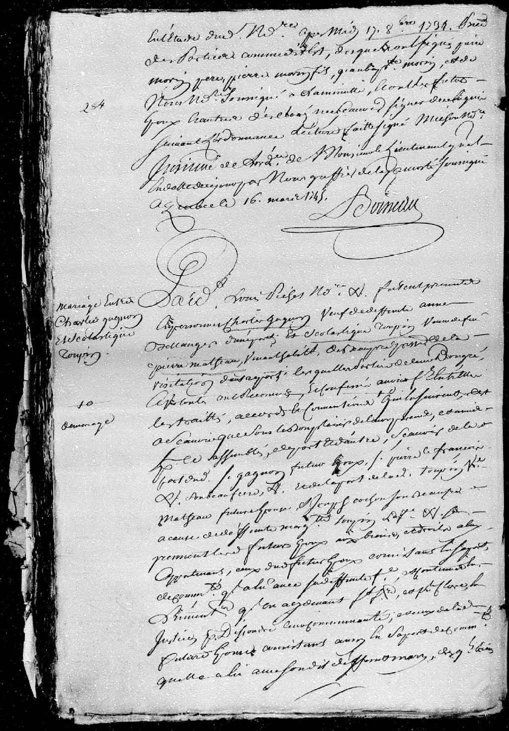 Contrat de mariage passé pardevant Louis Pichet, notaire royal, entre Charles Gagnon, veuf de défunte Anne Bellanger (Bélanger); et Scholastique Toupin, veuve de défunt Pierre Matheau (Mataut), vivant habitant de la seigneurie de Beaupré, paroisse de La Visitation, 24 juillet 1744 (Document insinué le 16 mars 1745), Archives nationales à Québec, Fonds Cour supérieure. District judiciaire de Québec. Insinuations, (03Q,CR301,P2511).