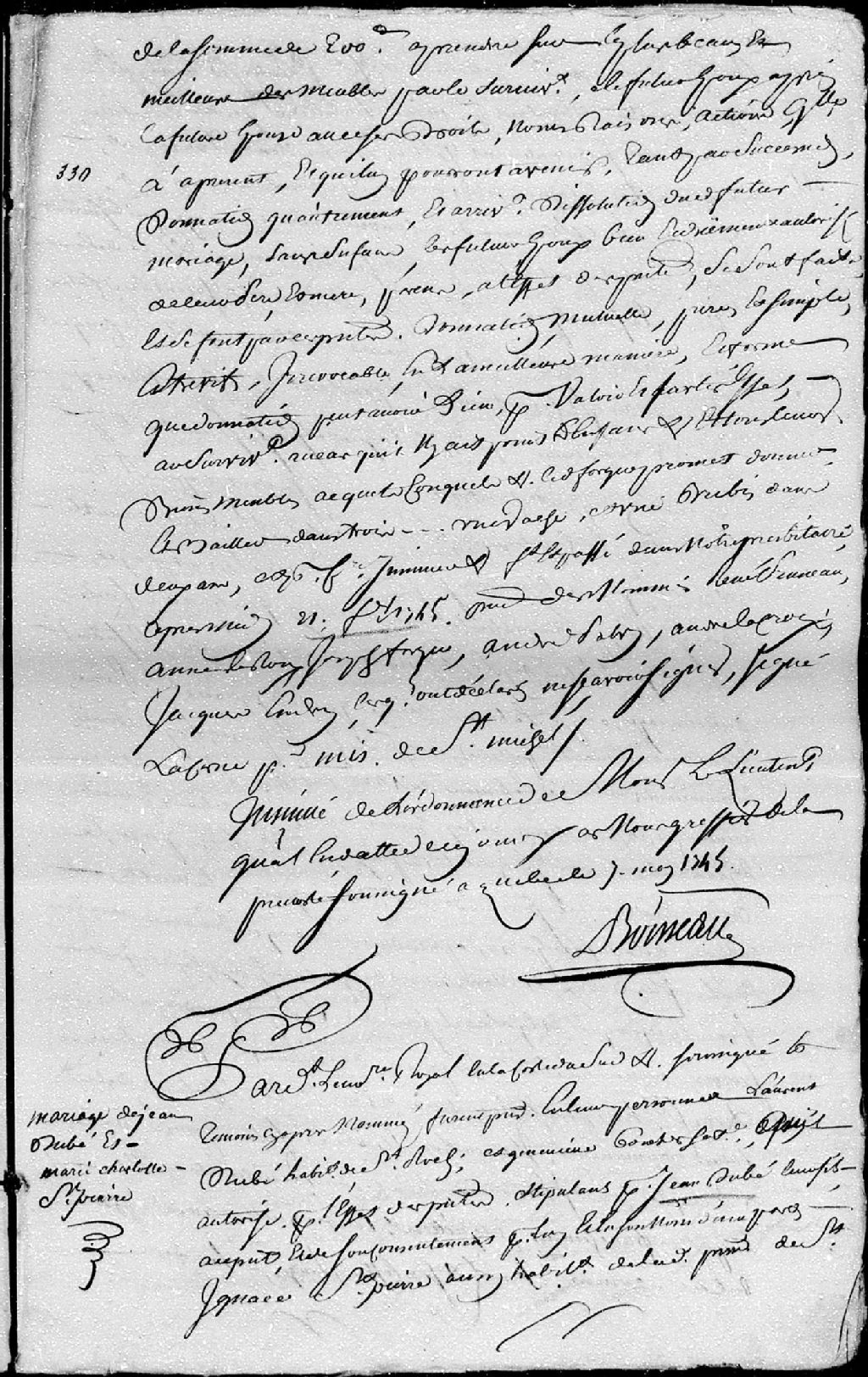 Contrat de mariage passé pardevant Joseph Dionne, notaire royal en la côte du Sud, entre Jean Dubé, fils de Laurent Dubé, habitant de Saint-Roch, et de Geneviève Boucher, ses père et mère; et Marie-Charlotte Saint-Pierre, fille d'Ignace Saint-Pierre, aussi habitant de la paroisse de Saint-Roch, et de Marie-Madeleine Pelletier, ses père et mère, 4 février 1745 (Document insinué le 18 mai 1745), Archives nationales à Québec, Fonds Cour supérieure. District judiciaire de Québec. Insinuations, (03Q,CR301,P2530).