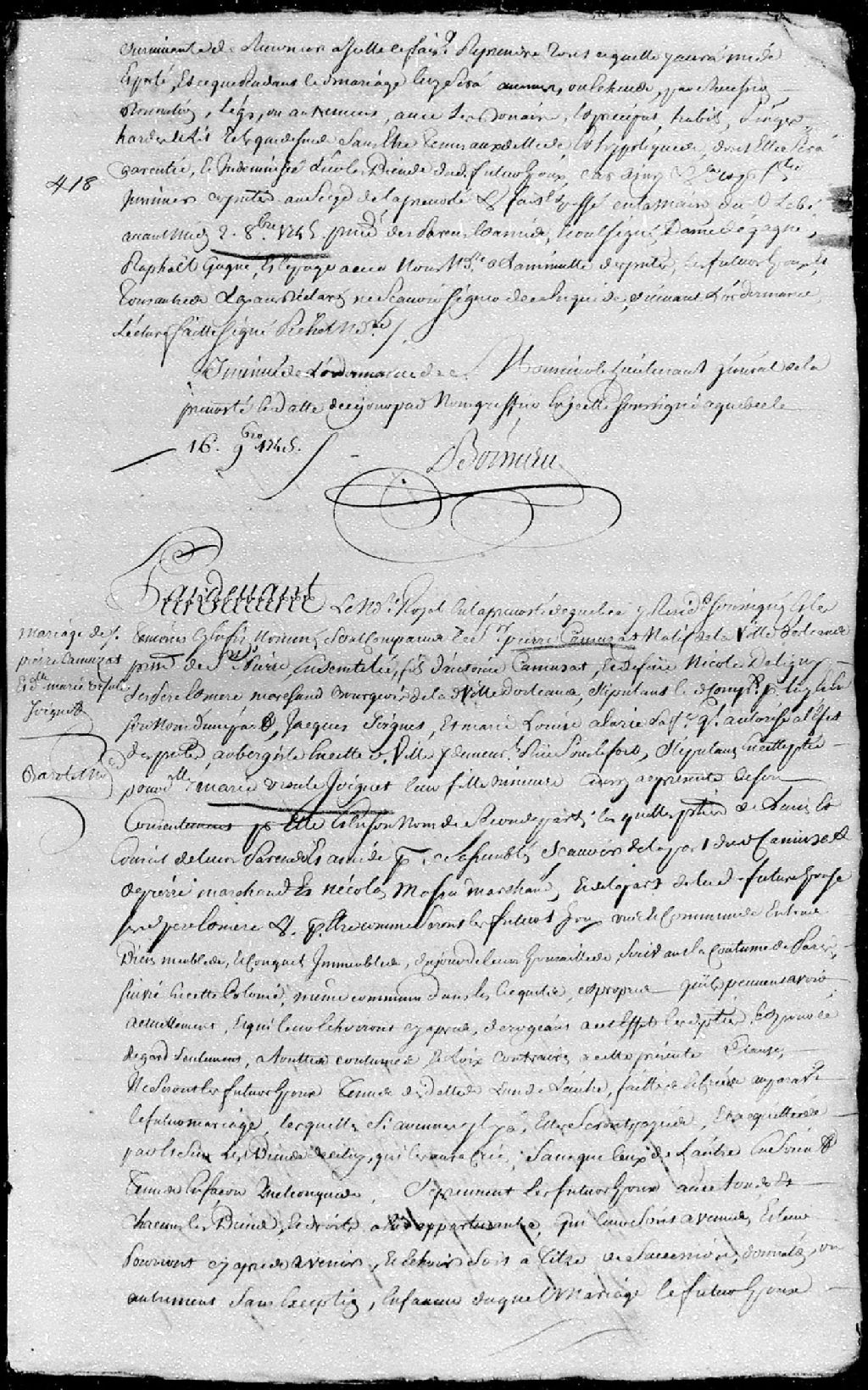 Contrat de mariage passé pardevant maître Barolet, notaire royal en la Prévôté de Québec, entre Pierre Camusat, natif de la ville d'Orléans, paroisse Saint-Pierre-Ensentelée, fils d'Antoine Camusat et de feue Nicole Deligny, ses père et mère, marchands bourgeois de la ville d'Orléans; et Marie-Ursule Joignet (Joignier), fille mineure de Jacques Joignet (Joignier dit Lafrance) et de Marie-Louise Alarie, ses père et mère, aubergistes de la ville de Québec, y demeurant, rue Sous-le-Fort