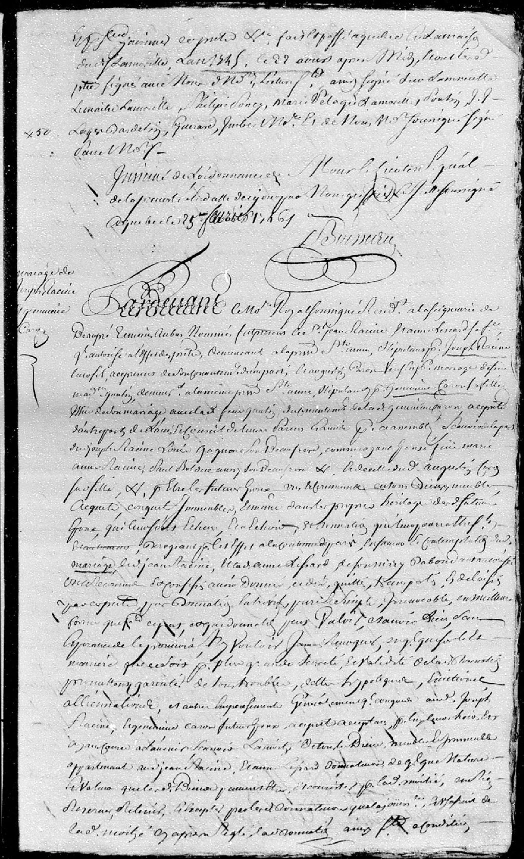 Contrat de mariage passé pardevant maître Jacob, notaire royal en la seigneurie de Beaupré, entre Joseph Racine, fils de Jean Racine et d'Anne Lessard, ses père et mère, demeurant en la paroisse Sainte-Anne; et Geneviève Caron, fille d'Augustin Caron et de feue Marie-Madeleine Gaulin, demeurant également en la paroisse de Sainte-Anne, 17 janvier 1746 (Document insinué le 25 février 1746), Archives nationales à Québec, Fonds Cour supérieure. District judiciaire de Québec. Insinuations, (03Q,CR301,P2597).