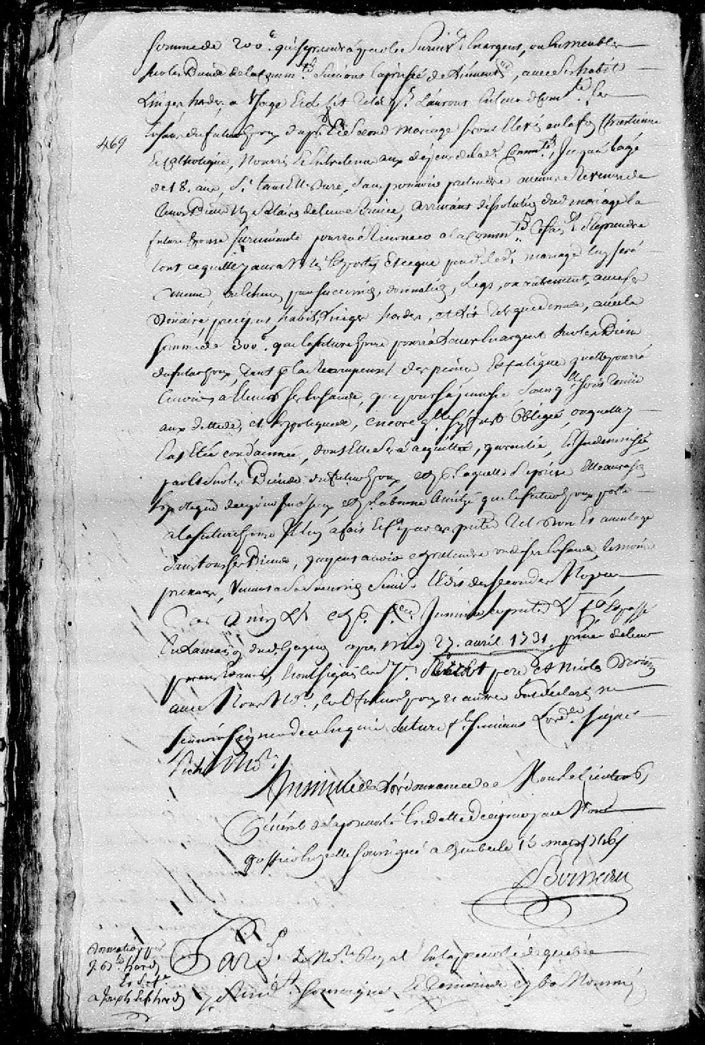 Contrat de mariage passé pardevant Louis Pichet, notaire de l'île et comté Saint-Laurent (île d'Orléans), entre Bertrand Perrot (Perrault), capitaine de milice demeurant en la paroisse Sainte-Famille, veuf de feue Marie-Angélique Simon, sa seconde femme, assisté de [Joseph] Perrot (Perrault), son père, commandant de milice audit comté; et Marie Gagnon, fille de Joseph Gagnon, habitant audit lieu, paroisse Sainte-Famille, et de Marie Cloutier, ses père et mère