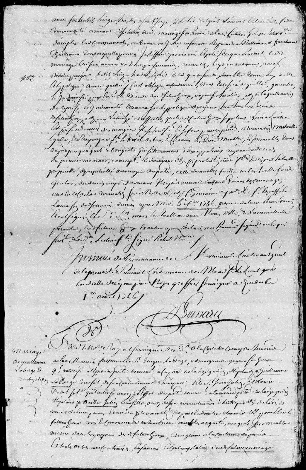Contrat de mariage passé pardevant maître Jacob, notaire royal en la seigneurie de Beaupré, entre Guillaume Laberge, fils de Jacques Laberge et de Marguerite Gagnon, ses père et mère, demeurant à la paroisse de L'Ange-Gardien; et Barbe Julien, fille de Jean Julien et de Louise Trudel, ses père et mère, demeurant également en la paroisse de L'Ange-Gardien