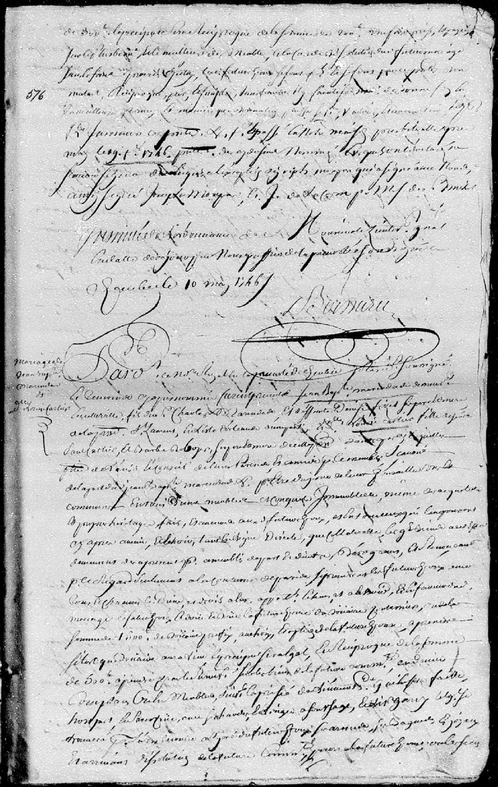 Contrat de mariage passé pardevant maître Pinguet, notaire royal en la Prévôté de Québec, entre Jean-Baptiste Marenda (Maranda), demeurant en la ville de Québec, fils de Charles Marenda (Maranda) et de défunte Denise Fizet (Fiset), ses père et mère, de la paroisse Saint-Laurent, en l'île d'Orléans; et Louise Cartier, fille des défunts Paul Cartier et Barbe Boyer, ses père et mère, de la paroisse Notre-Dame-de-Québec