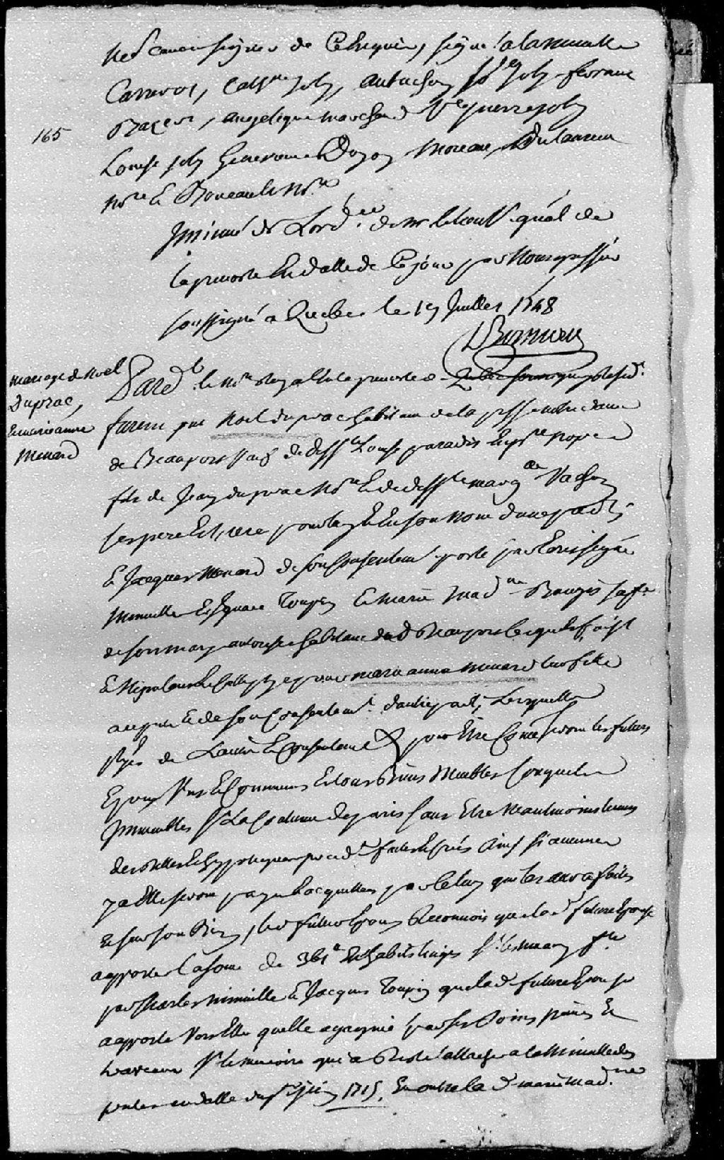 Contrat de mariage passé pardevant maître Rageot, notaire royal en la Prévôté de Québec, entre Noël Duprac, habitant de la paroisse Notre-Dame-de-Beauport, veuf en premières noces de défunte Louise Paradis, fils de Jean-Robert Duprac, notaire, et de défunte Marguerite Vachon, ses père et mère; et Marie-Anne Ménard, fille de Jacques Ménard et de Marie-Madeleine Baugis, habitants de Beauport, ses père et mère