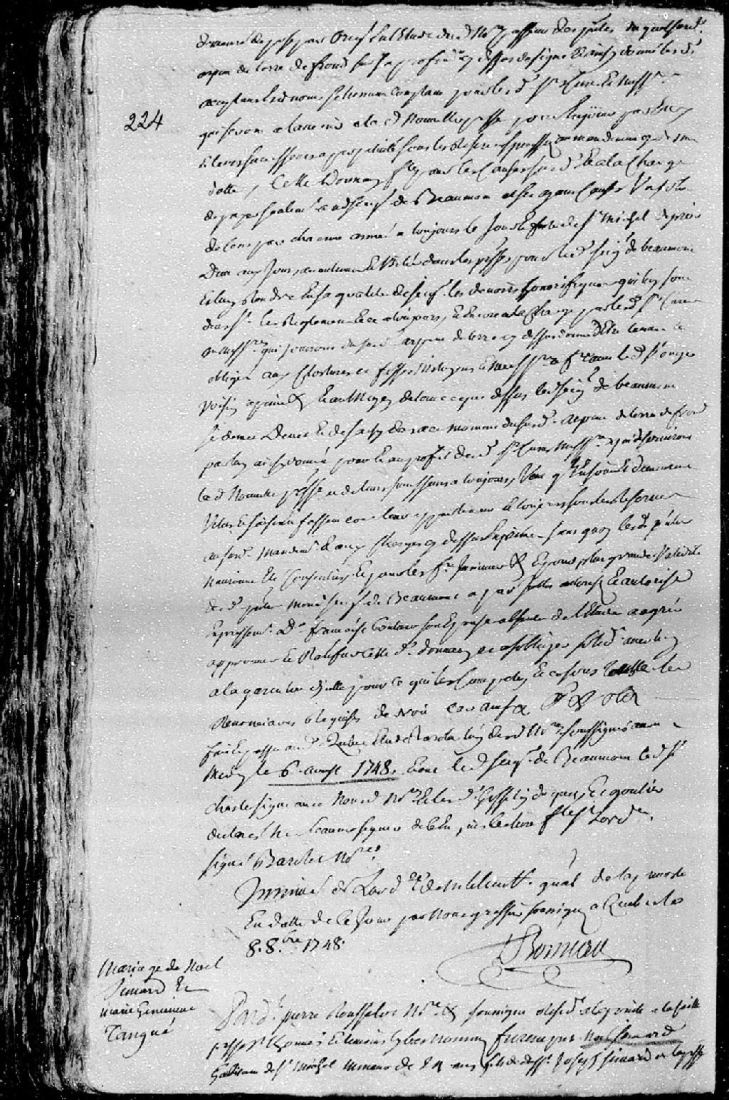 Contrat de mariage passé pardevant Pierre Rousselot, notaire demeurant à la Pointe-à-la-Caille, paroisse Saint-Thomas, entre Noël Simard, habitant de Saint-Michel, mineur de vingt-quatre ans, fils de défunt Joseph Simard, de la paroisse Sainte-Anne, et de Marie Boivin, ses père et mère; et Marie-Geneviève Tangué (Tanguay), mineure de dix-sept ans, fille de Jean-Baptiste Tangué (Tanguay), habitant de Saint-Vallier, et de défunte Marie-Françoise Blais, ses père et mère