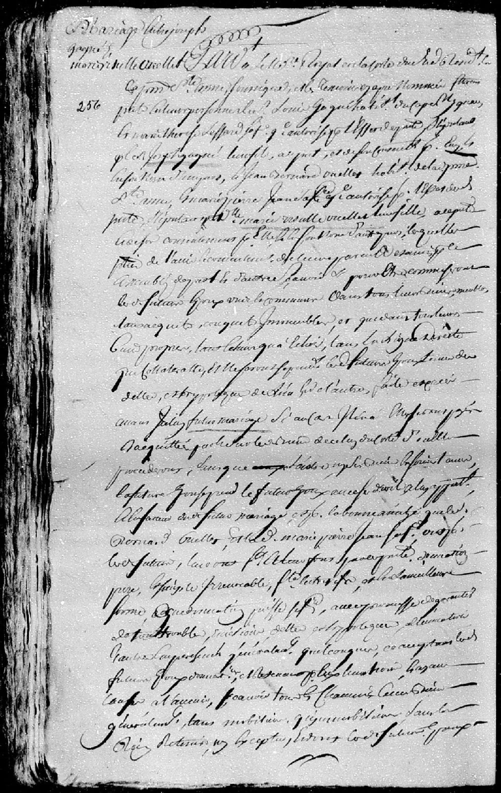 Contrat de mariage passé pardevant Joseph Dionne, notaire royal en la côte du Sud, entre Joseph Gagné, fils de Louis Gagné, habitant du Cap-Saint-Ignace, et de Marie-Thérèse Lessard, ses père et mère; et Marie-Ursule Ouellet, fille de Jean-Bernard Ouellet, habitant de la paroisse Sainte-Anne, et de Marie-Pierre Jean, ses père et mère, 4 août 1748 (Document insinué le 12 novembre 1748), Archives nationales à Québec, Fonds Cour supérieure. District judiciaire de Québec. Insinuations, (03Q,CR301,P2935).