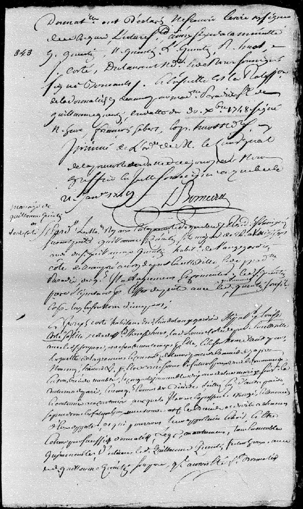 Contrat de mariage passé pardevant Boucault et Dulaurent, notaires royaux en la Prévôté de Québec, entre Guillaume Quentin (Cantin), majeur de vingt-six ou vingt-sept ans, fils de Guillaume Quentin (Cantin), habitant de L'Ange-Gardien, côte de Beaupré, et de Madeleine Paradis, ses père et mère; et Louise Costé (Côté), fille de Joseph Costé (Côté), aussi habitant de L'Ange-Gardien, et de défunte Thérèse Huot, ses père et mère, 30 octobre 1748 (Document insinué le 21 janvier 1749), Archives nationales à Québec, Fonds Cour supérieure. District judiciaire de Québec. Insinuations, (03Q,CR301,P2969).