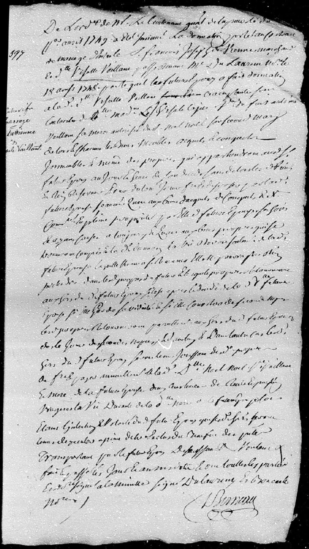 Extrait du contrat de mariage passé pardevant Boucault et Dulaurent, notaires, entre François-Joseph de Vienne (Devienne), marchand; et Ursule Vaillant, fille de feu Antoine Vaillant et de Marie-Madeleine-Ursule Lajus, à présent femme de Noël Noël; ledit contrat contient une donation faite par ledit Devienne de tous les biens meubles et immeubles qui pourront lui appartenir au jour de son décès, au profit de sa future épouse, 18 août 1748 [Document insinué le 1er avril 1749], Archives nationales à Québec, Fonds Cour supérieure. District judiciaire de Québec. Insinuations, (03Q,CR301,P3009).
