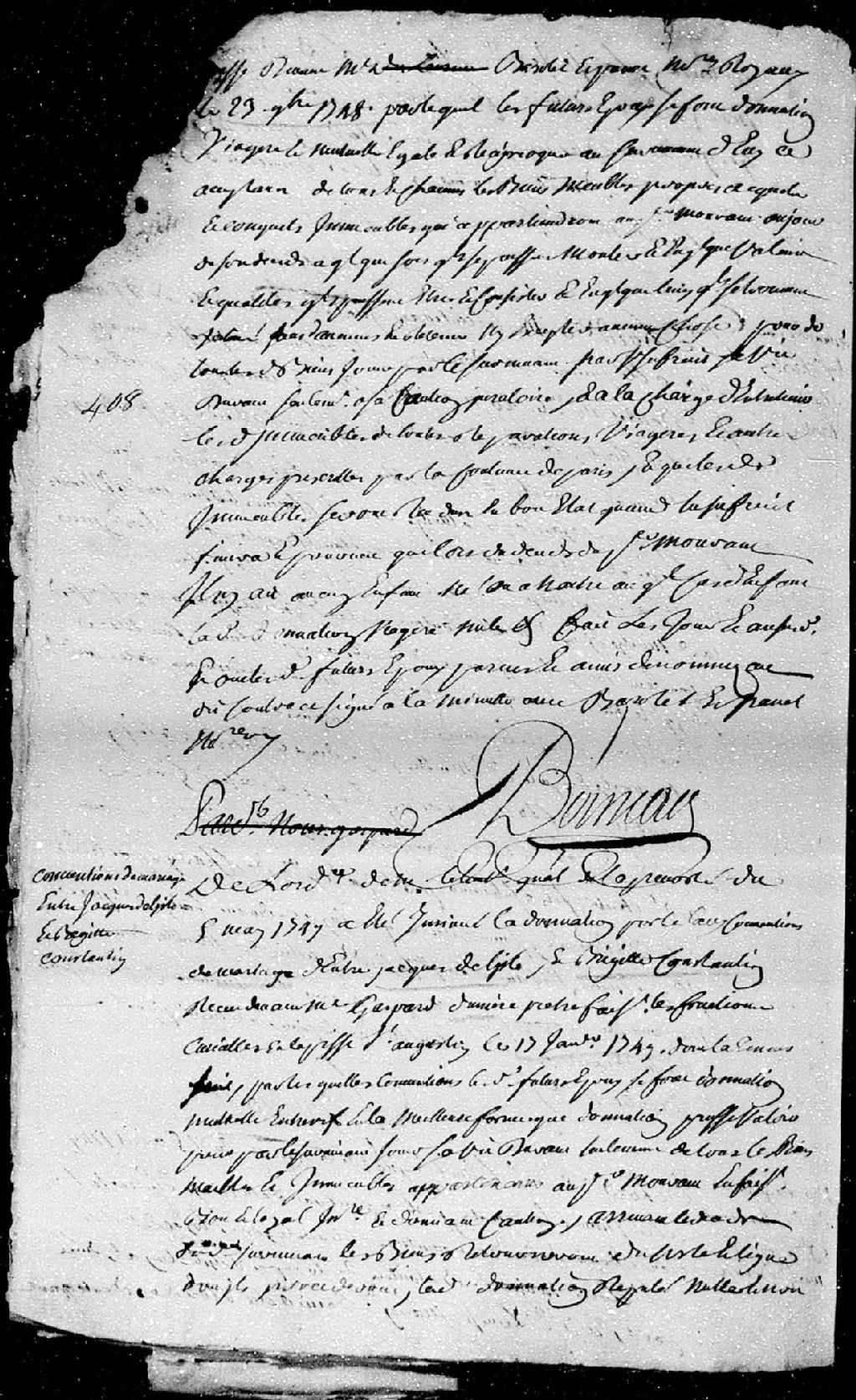Extrait du contrat de mariage portant donation mutuelle, passé pardevant Gaspard Dunière, prêtre faisant les fonctions curiales en la paroisse Saint-Augustin, entre Jacques Delisle et Brigitte Constantin (dite Lavallée), 17 janvier 1749 [Document insinué le 5 mai 1749], Archives nationales à Québec, Fonds Cour supérieure. District judiciaire de Québec. Insinuations, (03Q,CR301,P3019).